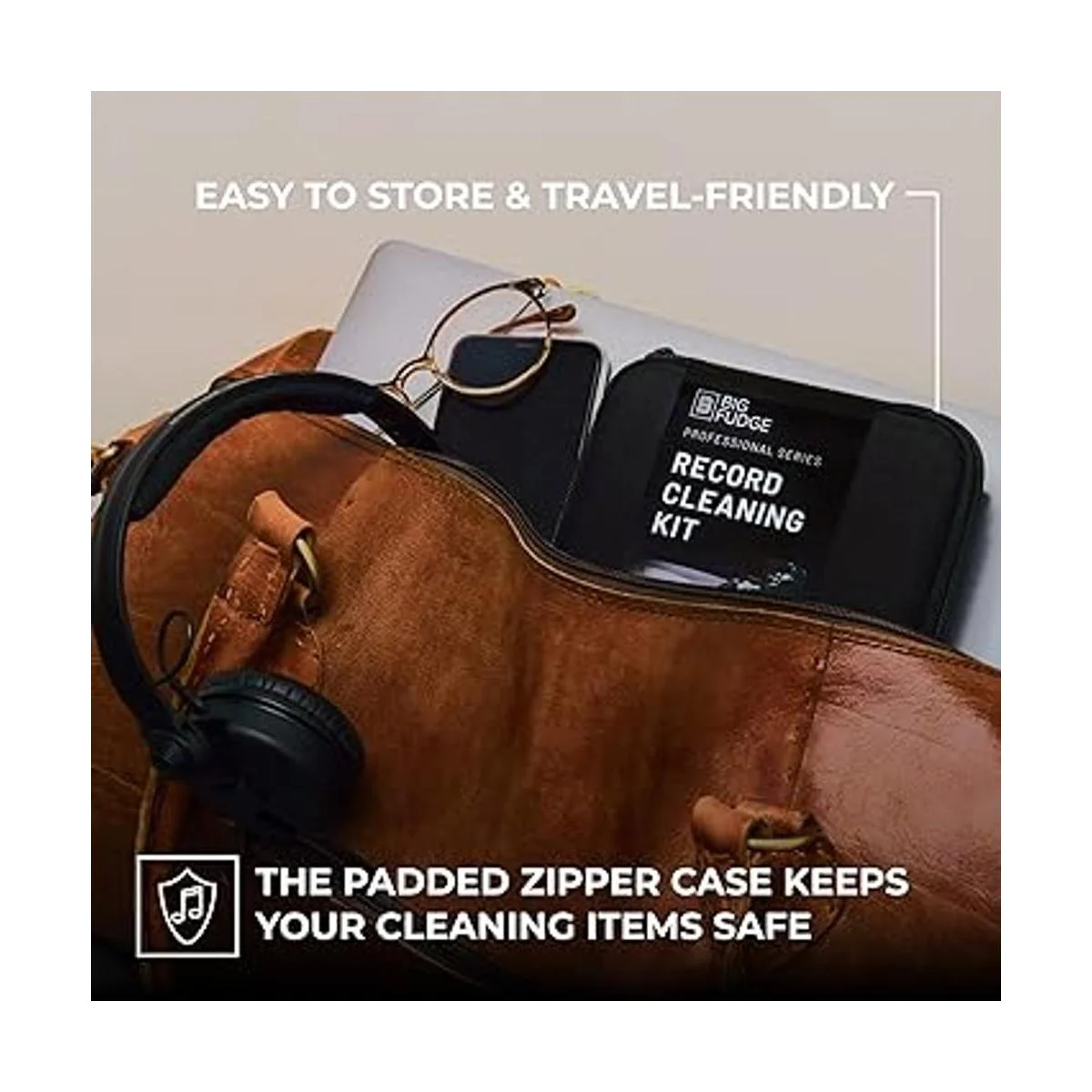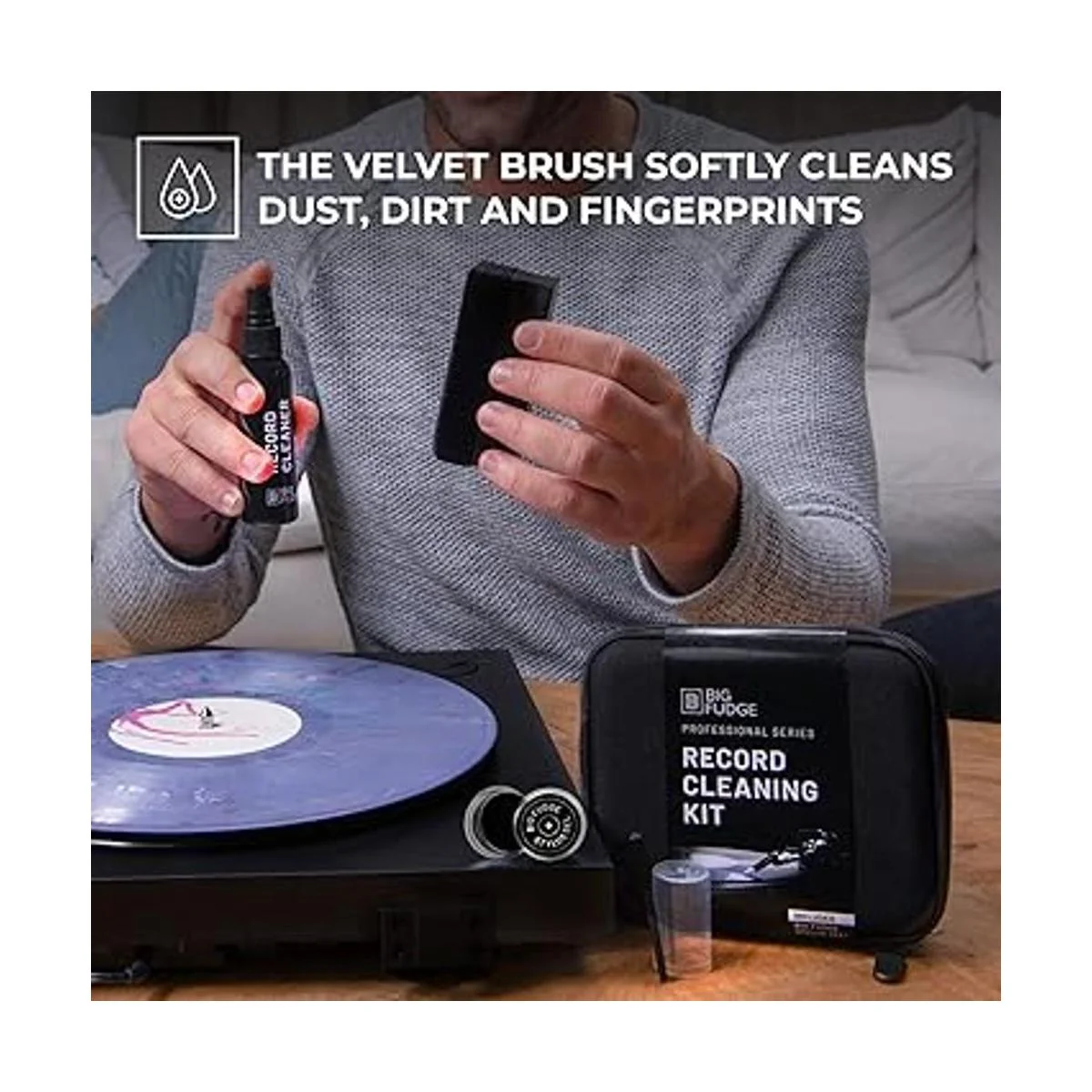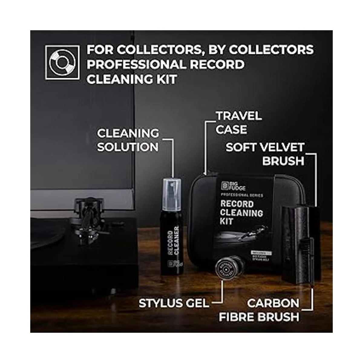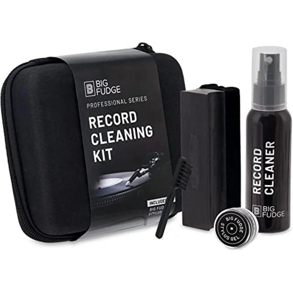Big Fudge Kit de limpieza de discos de vinilo de la serie profesional, 5 en 1, incluye cepillo limpiador de vinilo de terciopelo, líquido de limpieza, gel Stylus, cepillo para terciopelo, funda de almacenamiento acolchada