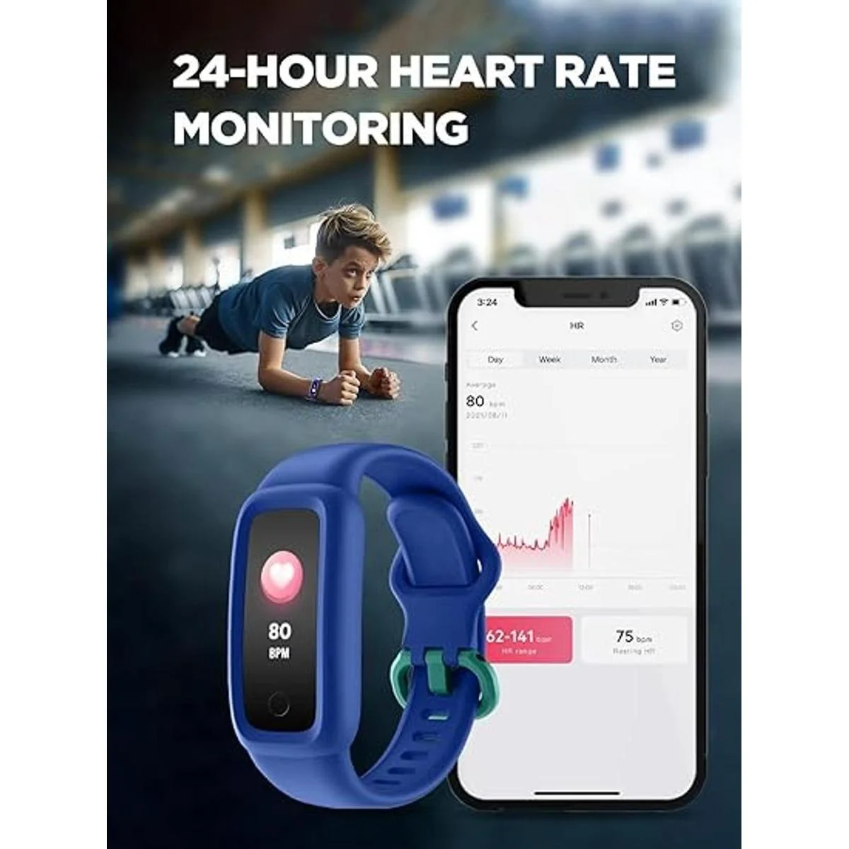 Seguimiento de actividad durante todo el día y natación IP68 resistente al agua: este rastreador de actividad de 24 horas cuenta automáticamente los pasos, la distancia y las calorías quemadas y los minutos de actividad de tus hijos. Soporta más de 10 modos de actividad: caminar, correr, ciclismo, baile, baloncesto, fútbol, tenis, escalada, entrenamiento y mucho más. Tiene una clasificación IP68 impermeable para que tus hijos puedan usarlo durante las actividades acuáticas y mientras disfrutan del tiempo de la piscina.