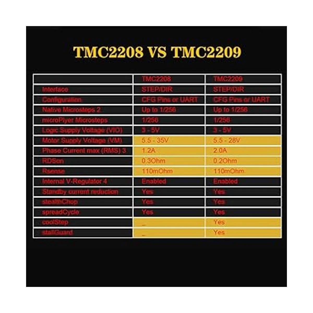 Paquete de 6: viene en 6 controladores de motor paso a paso TMC2209 y disipador de calor. Gracias al StealthChop2, TMC2209 sirve como controlador de motor paso a paso ultra silencioso con una corriente continua de hasta 2.0 A con picos de 2.8 A. El voltaje varía de 5,5 V a la salida máxima de 28 V.