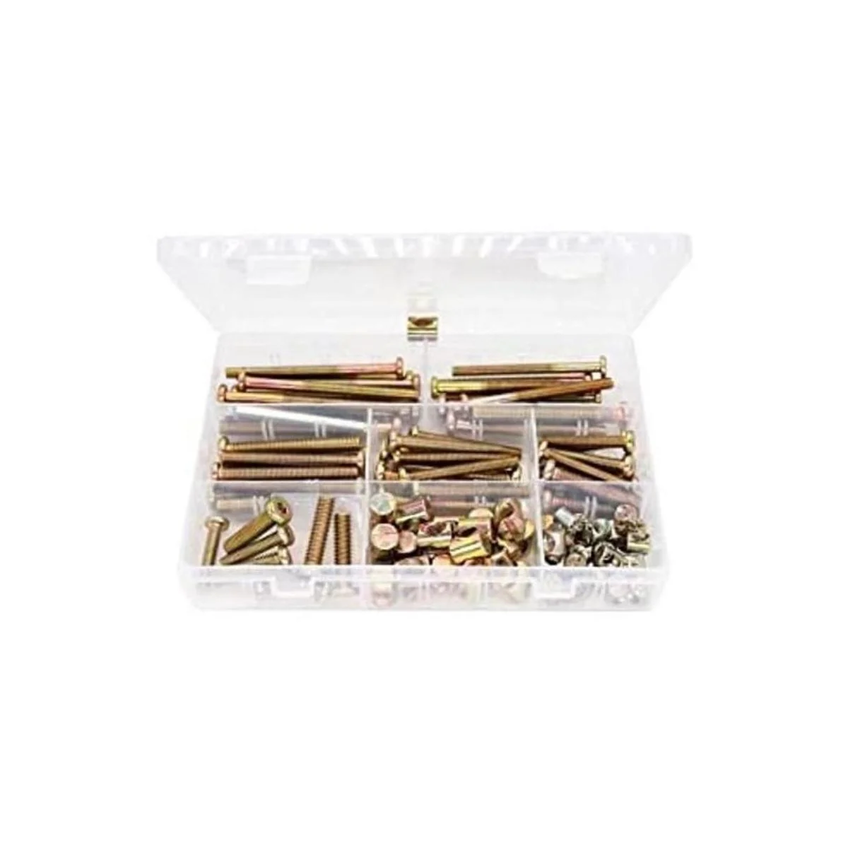 Paquete: 48 pernos, 50 tuercas de barril, todo en una caja de almacenamiento de plástico transparente.