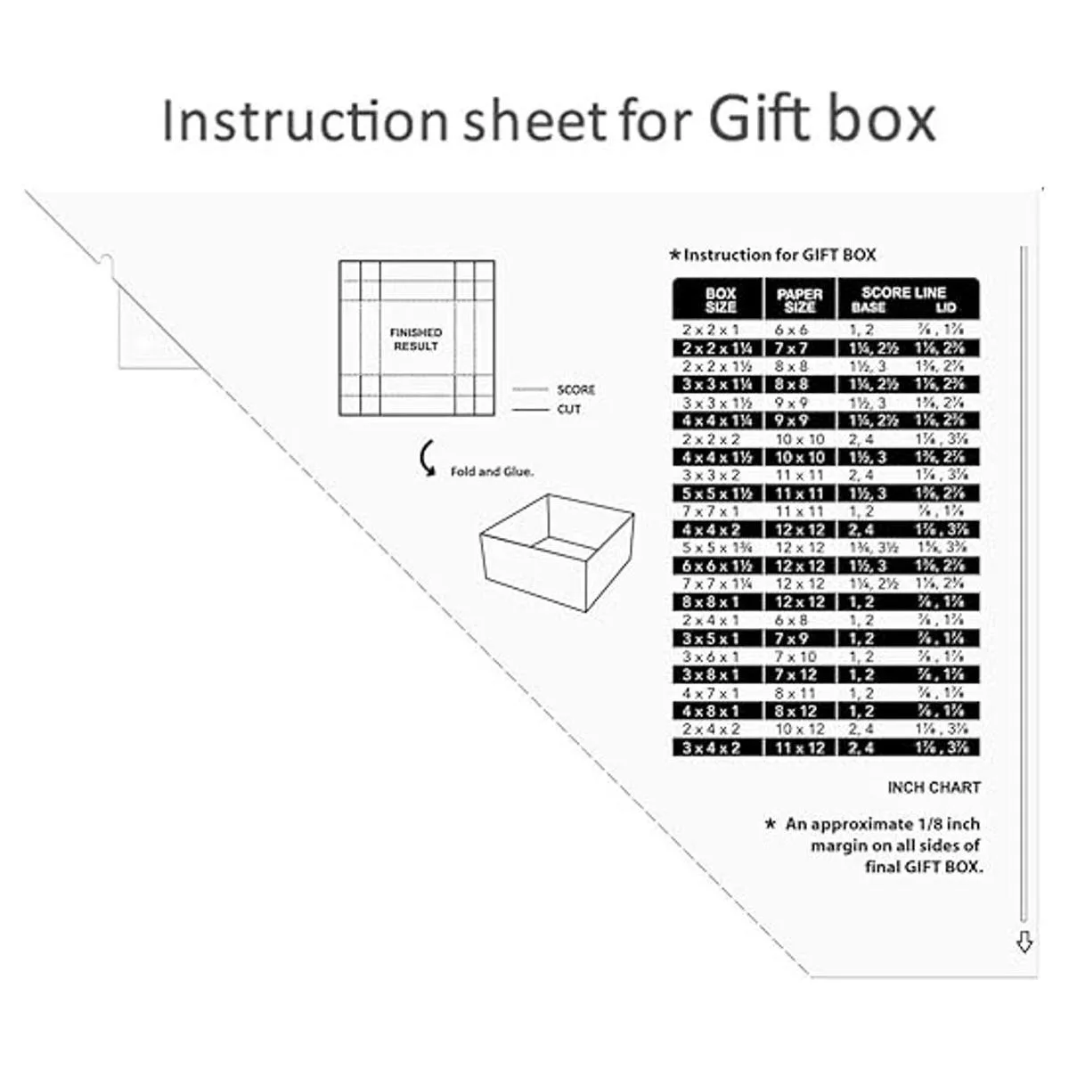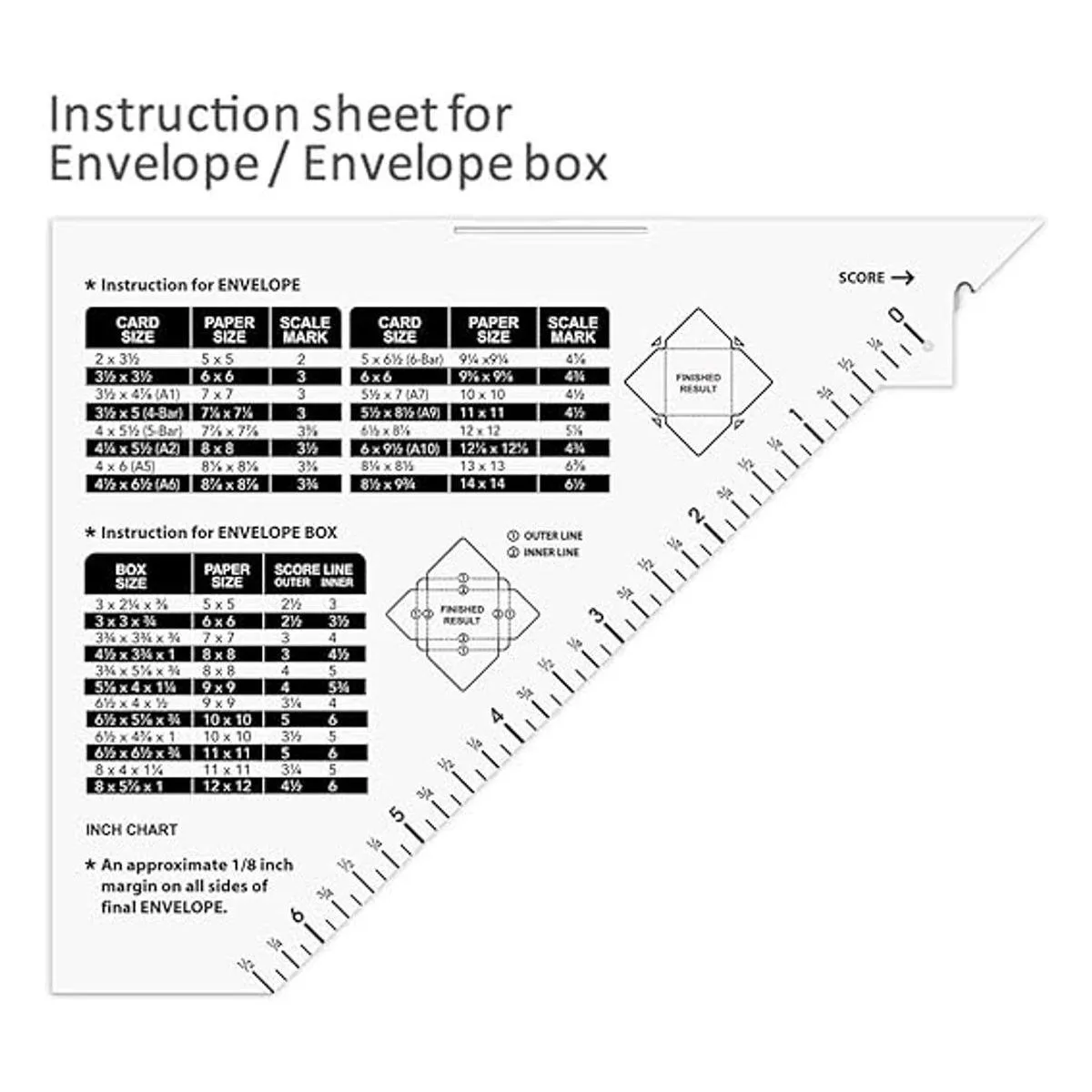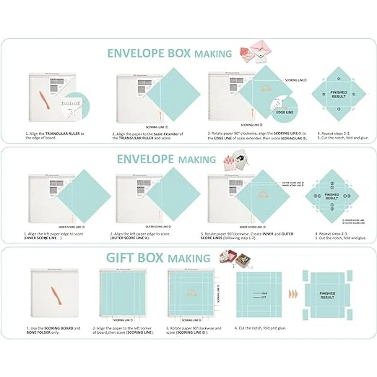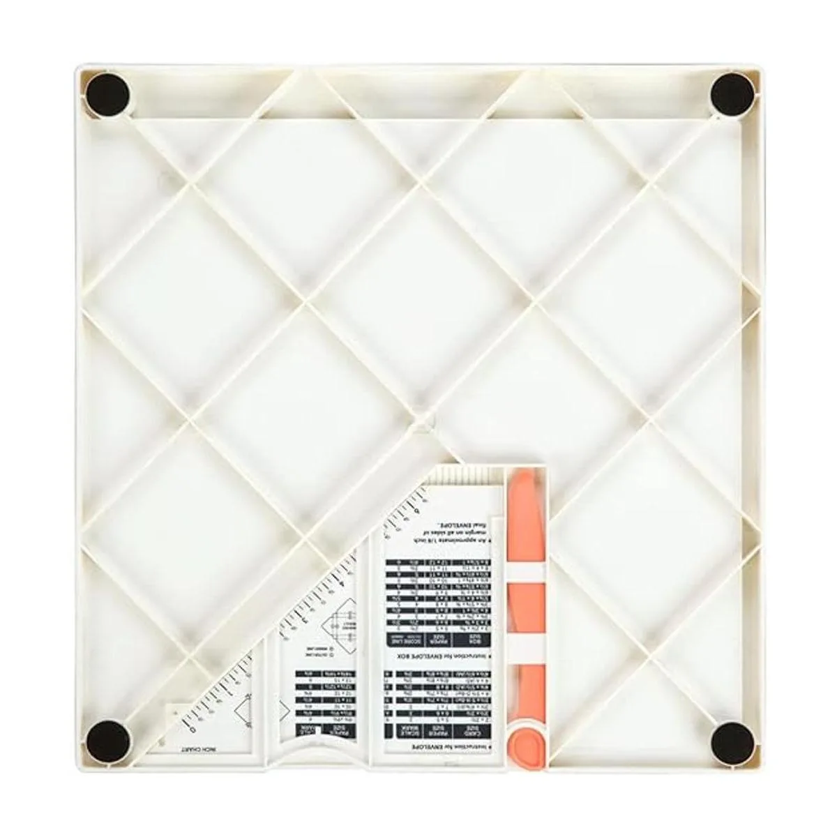 rea de trabajo de 12 x 12 pulgadas con guías cada 1/8 pulgadas. Incluye tablero de puntuación herramienta de puntuación y plegado sobres y caja.
