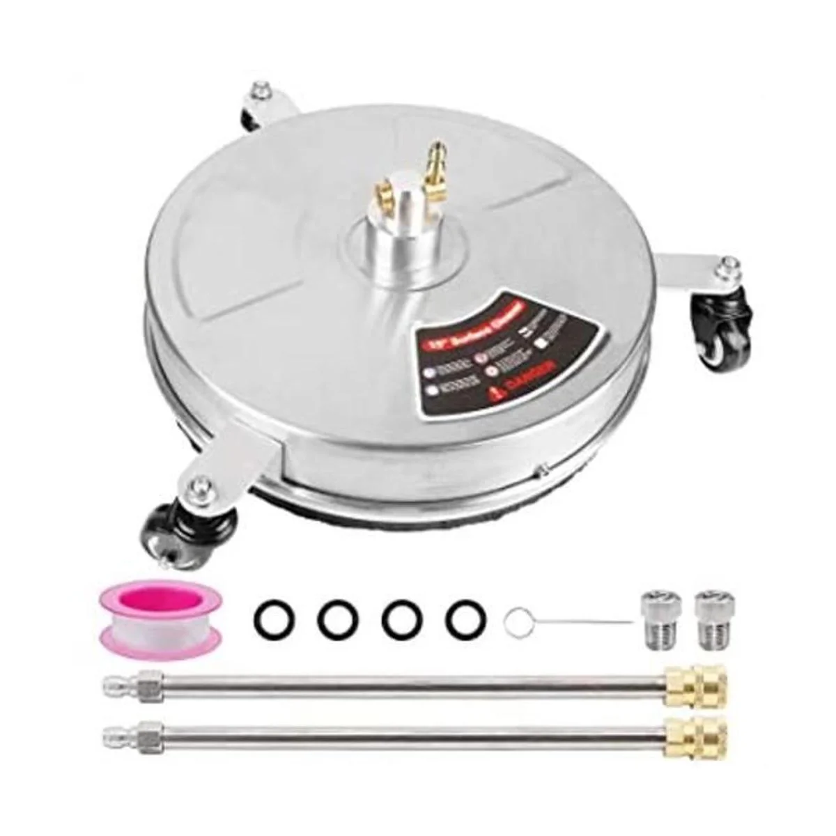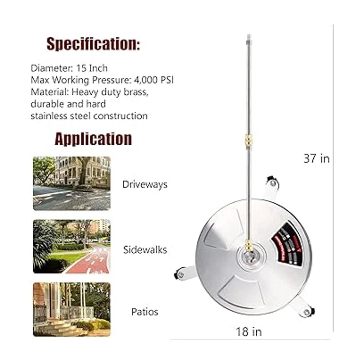 Paquete: limpiador de superficies de lavado a presión incluye: 1 limpiador de superficies de acero inoxidable de 15 pulgadas, 1 varita de extensión de 15 pulgadas, 2 boquillas de repuesto, 1 cinta de sellado de rosca, 4 juntas tóricas, 1 limpiador de boquillas. La presión de trabajo es de hasta 4000 PSI. Presión mínima requerida 2000 PSI, caudal mínimo 1.8 GPM, caudal máximo 3.7 GPM.