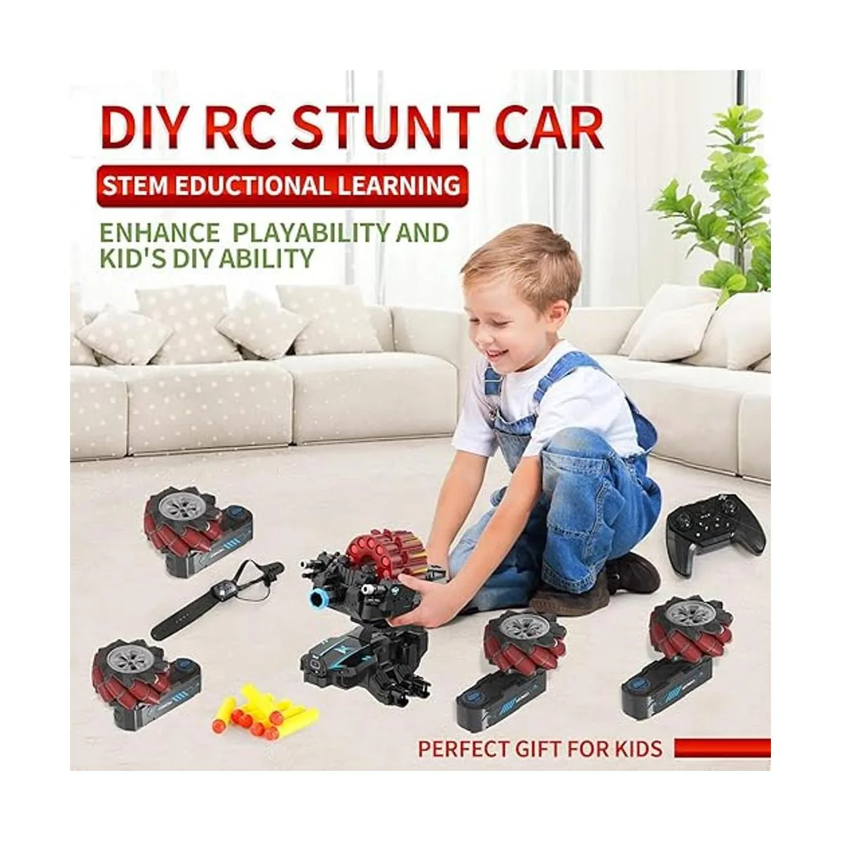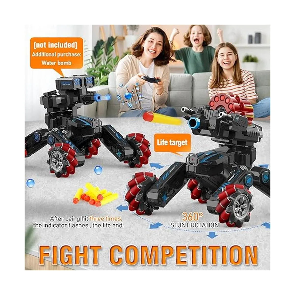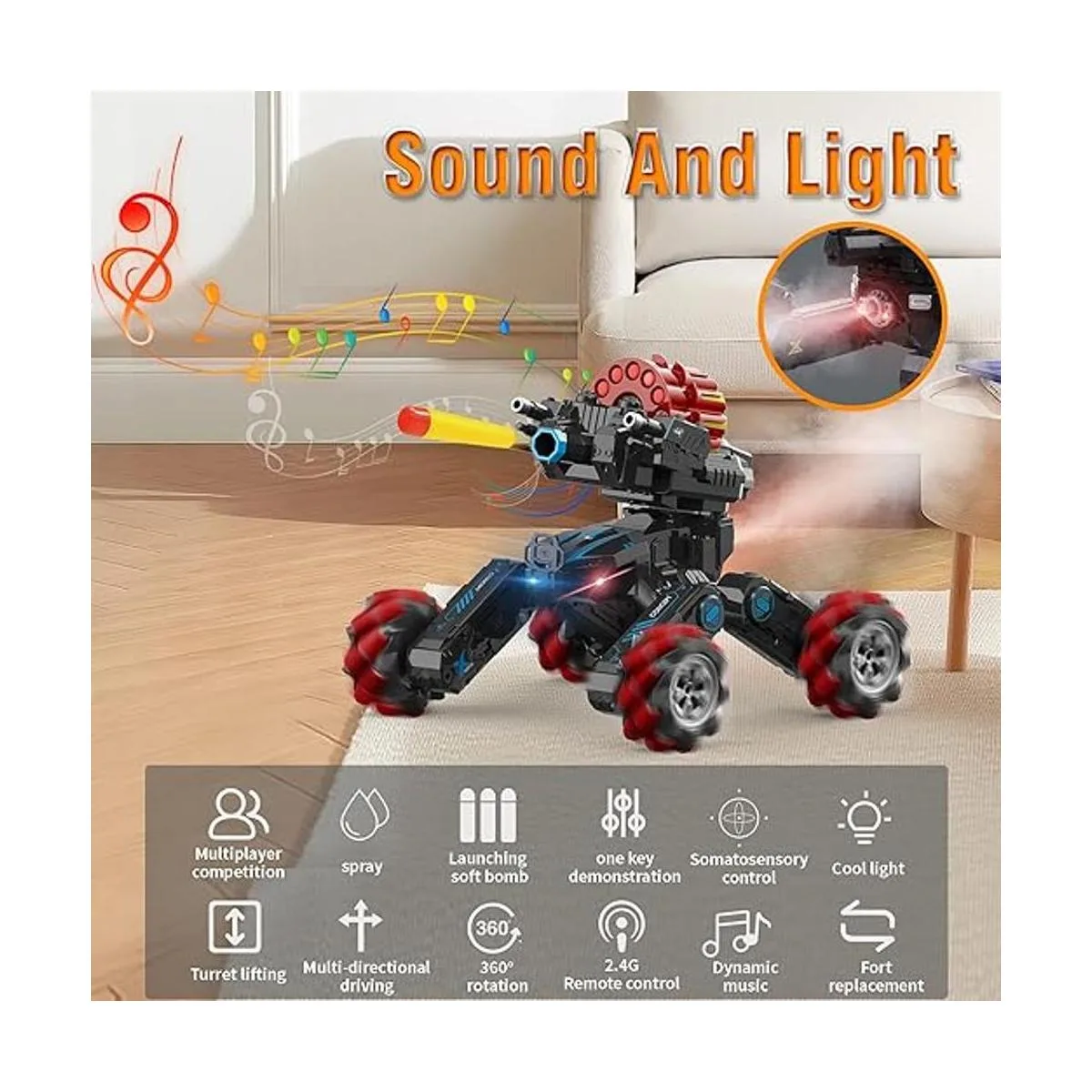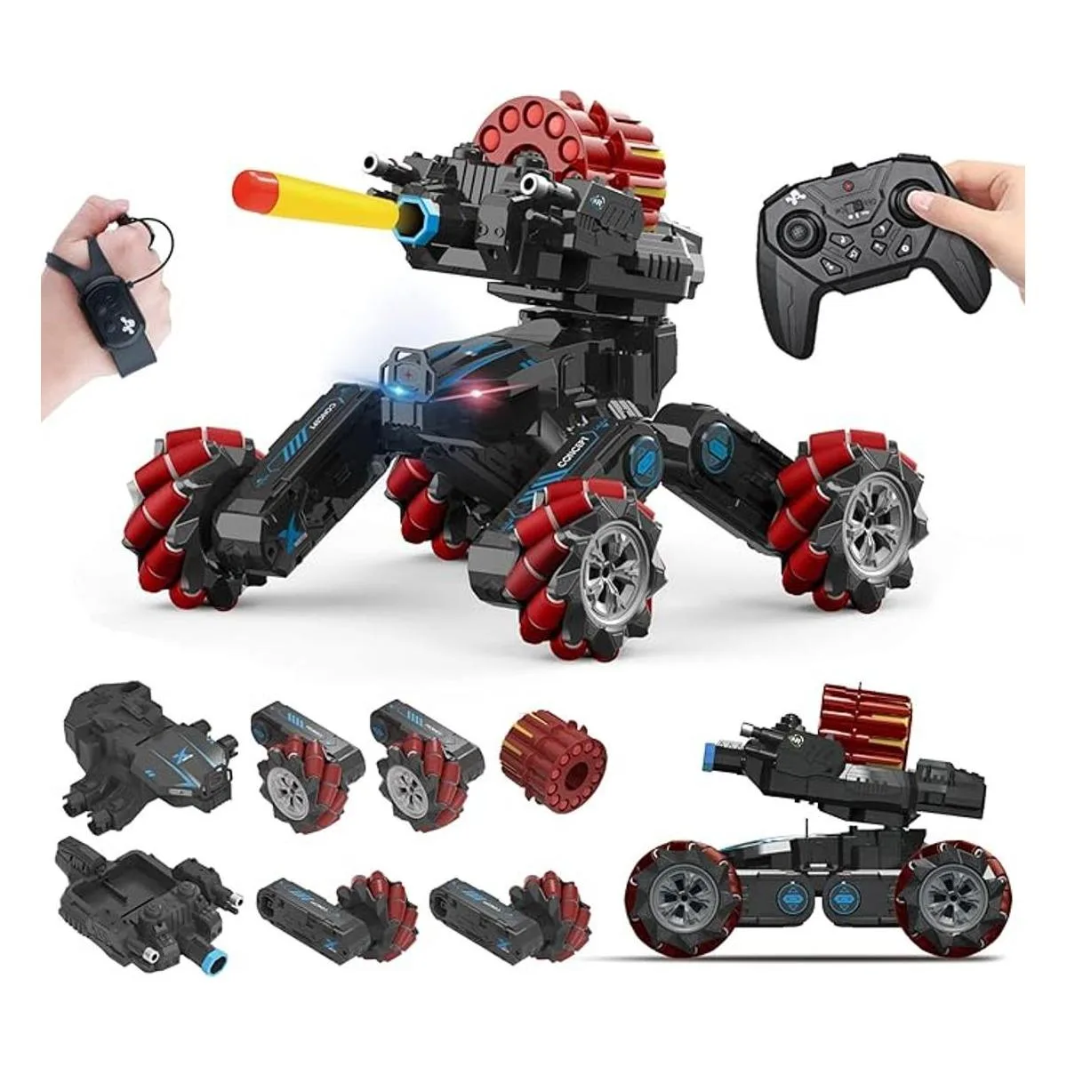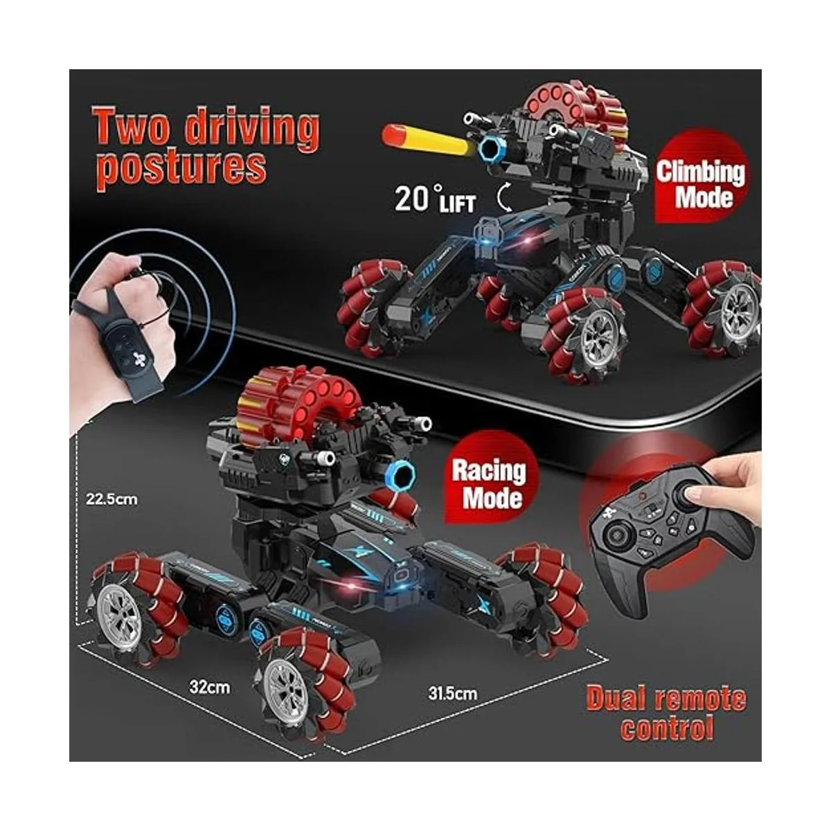 Punto de venta y características Modo dual: sensor de gestos de mano y control remoto; deriva RC 4WD, acrobacias, coche de batalla; 2 torretas intercambiables de dardos de espuma suave o bomba de bala de agua; spray de agua con luz; LED flash; rotación de 360 con música; demostración de una tecla; modo de carreras y escalada; juguete modular de bricolaje.