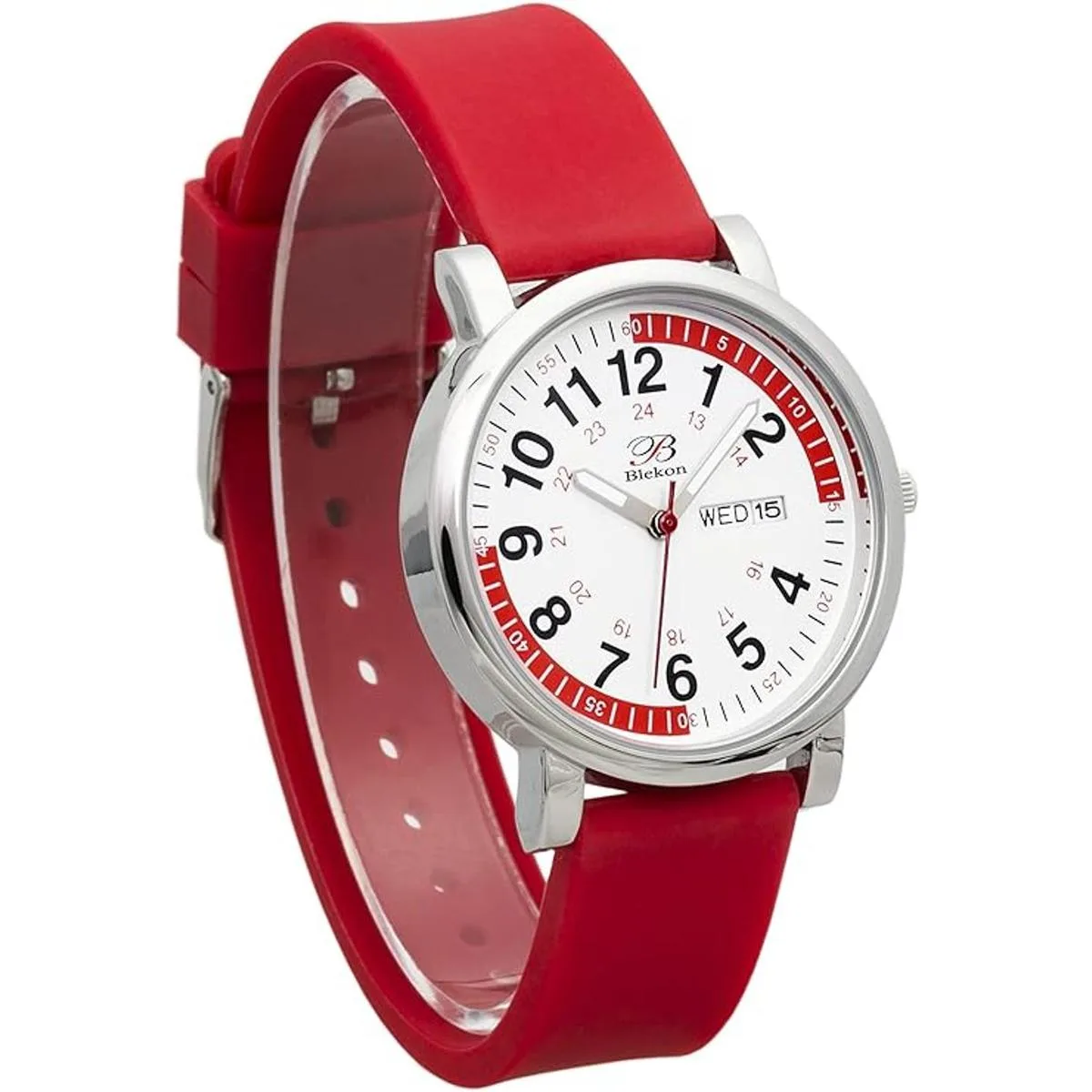 Blekon Reloj de enfermería original Colores médicos quirúrgicos, pulsómetro rojo de quince minutos, esfera de fácil lectura con indicador de día y fecha, reloj de segunda mano, resistente al agua