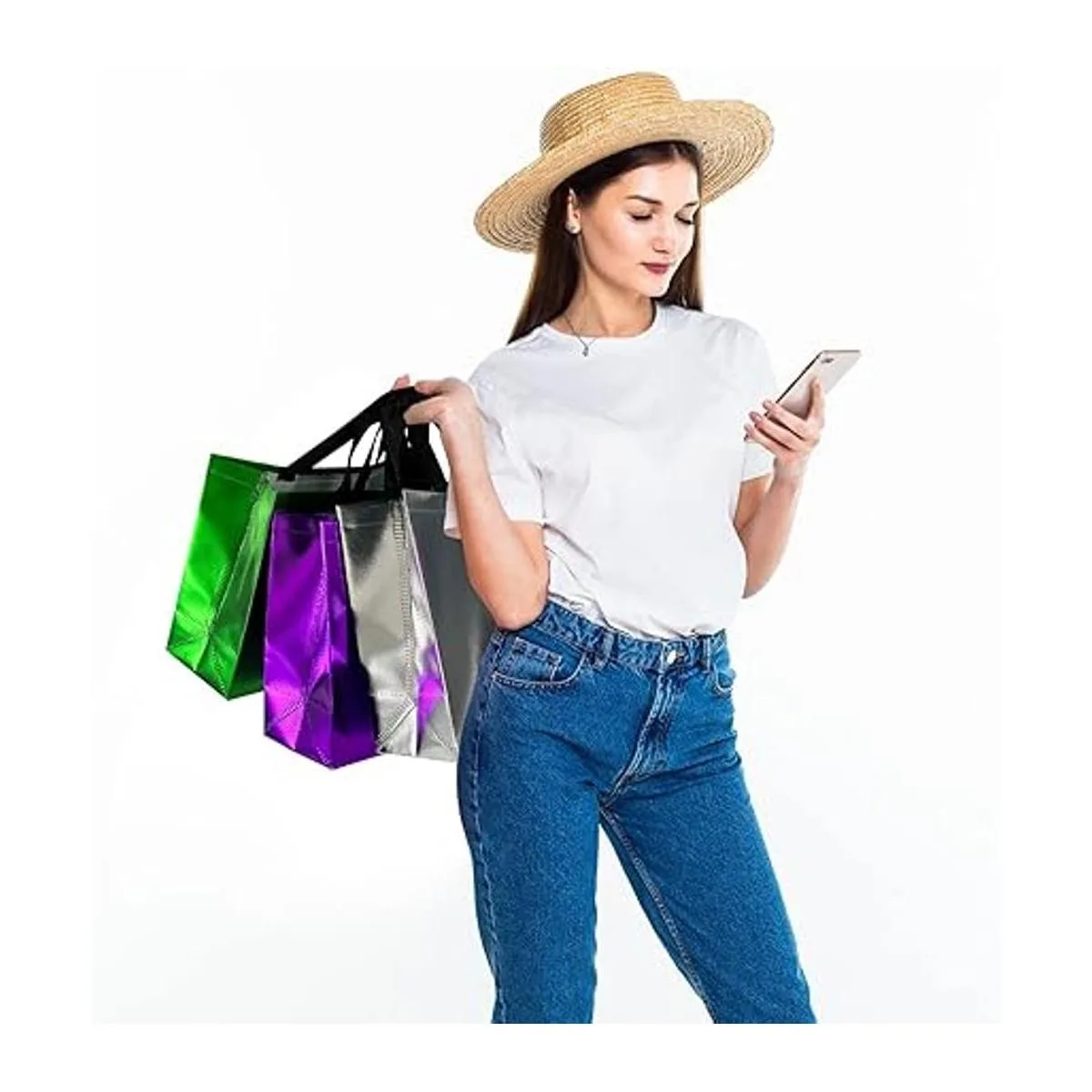 Bolsas de regalo reutilizables de gran tamaño: nuestras bolsas reutilizables brillantes están hechas de hilado no tejido con película aluminizada, no es fácil de romper, impermeable, no inflamable y pueden proporcionarte una larga vida útil. Cada bolsa de regalo mide 13.0 x 5.1 x 10.9 in. La capacidad de la bolsa es lo suficientemente grande como para contener la mayoría de los artículos que deseas empacar.