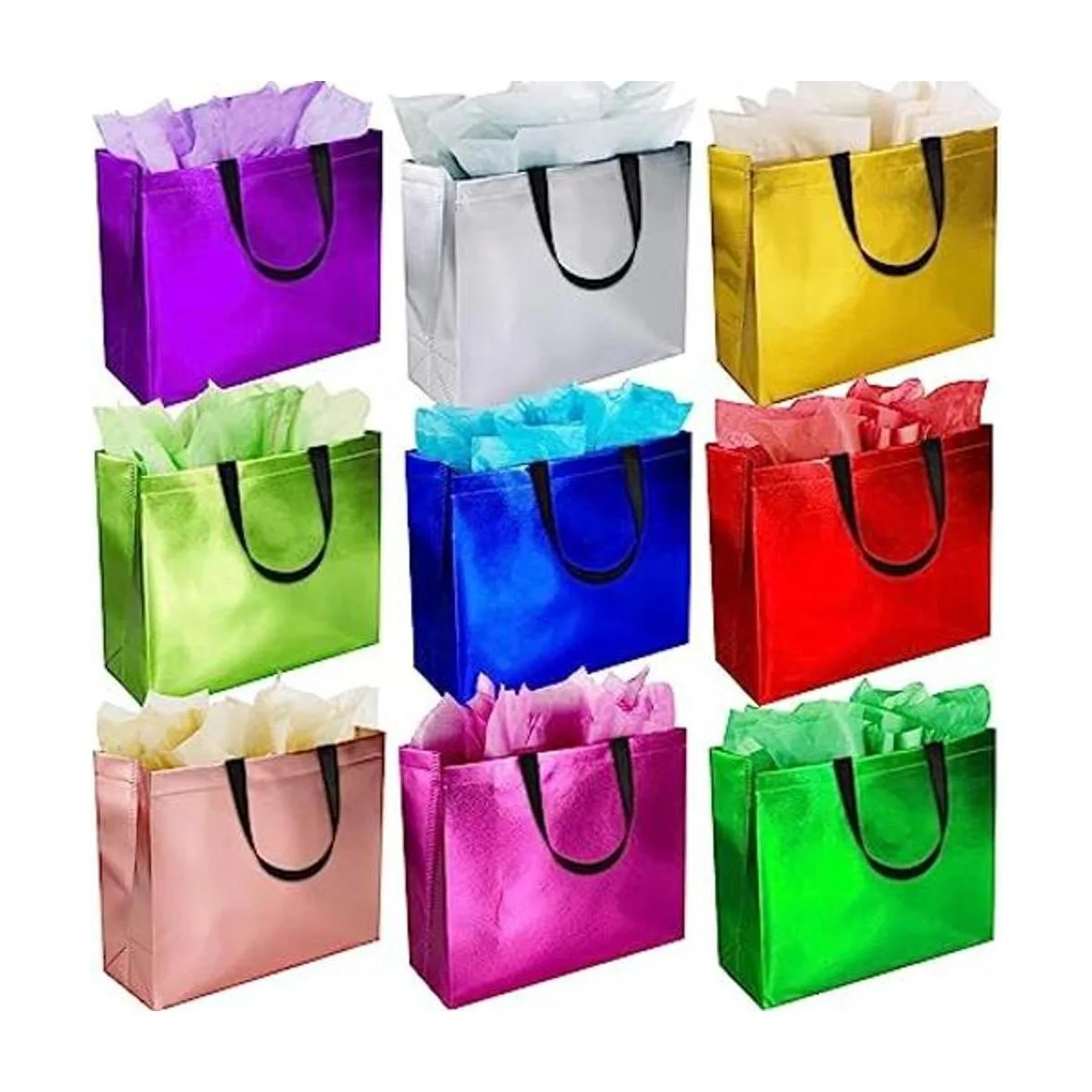 BLEWINDZ 18 bolsas de regalo de gran tamaño con 18 pañuelos, bolsas de regalo reutilizables con asas, bolsas de regalo brillantes de 9 colores, perfectas para compras, bodas, Navidad, suministros de cumpleaños 13 x 5 x 11 pulgadas