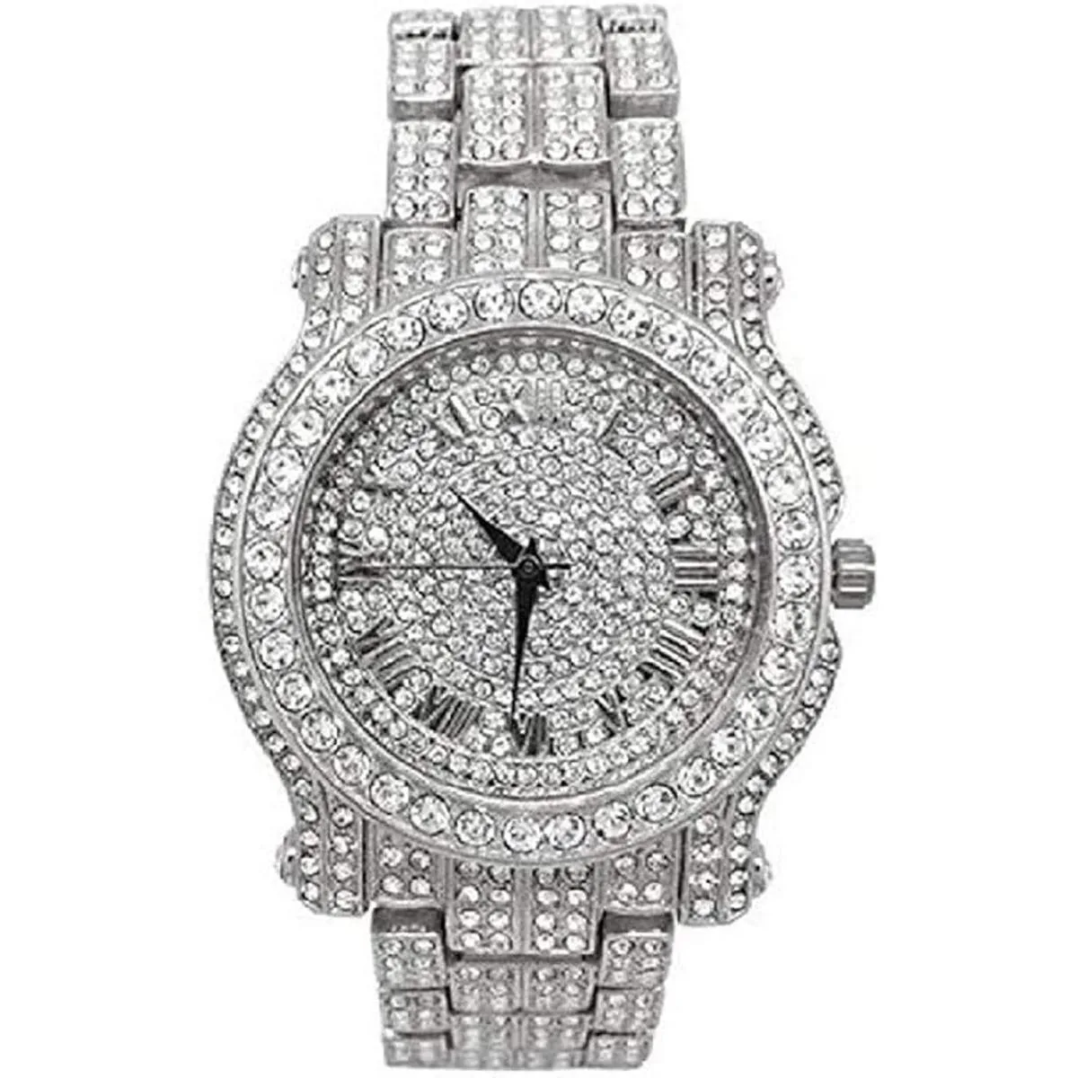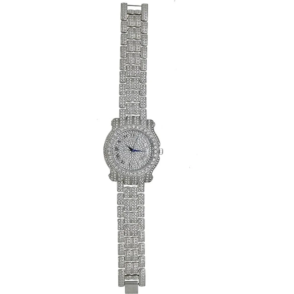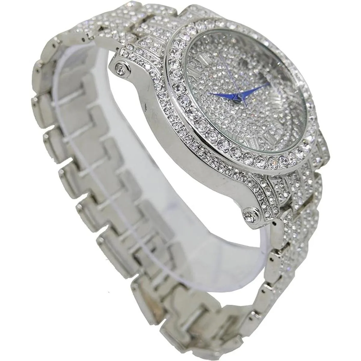 Los números romanos fáciles de leer en la esfera están llenos de diamantes de imitación y tienen elegantes manecillas de hora, minutos y segundos de color azul real.