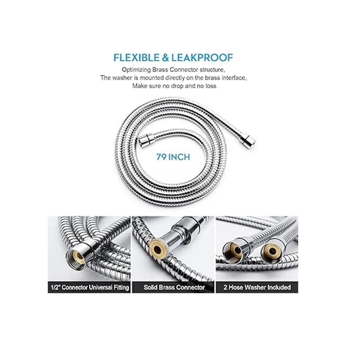 Manguera de ducha cromada extra larga de 79 pulgadas, diseño único de doble bloqueo con la arandela impermeable integrada, hace que la instalación de la manguera de ducha sea mucho más fácil sin cinta.
