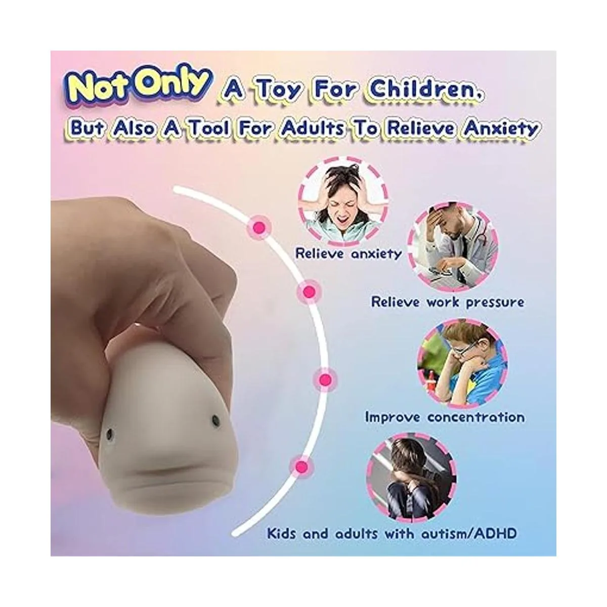 Muchas maneras de jugar: este juguete de descompresión puede estirarse, apretar y vencer a voluntad, dando a las personas ansiosas una sensación muy cómoda de descompresión y manteniendo a las personas tranquilas y relajadas. También es aplicable a cualquier escena como oficina, escuela, familia y estación. Incluso se puede utilizar como un juguete de viaje en la bolsa. Cuando no juegas, se puede colocar en la mesa como decoración.