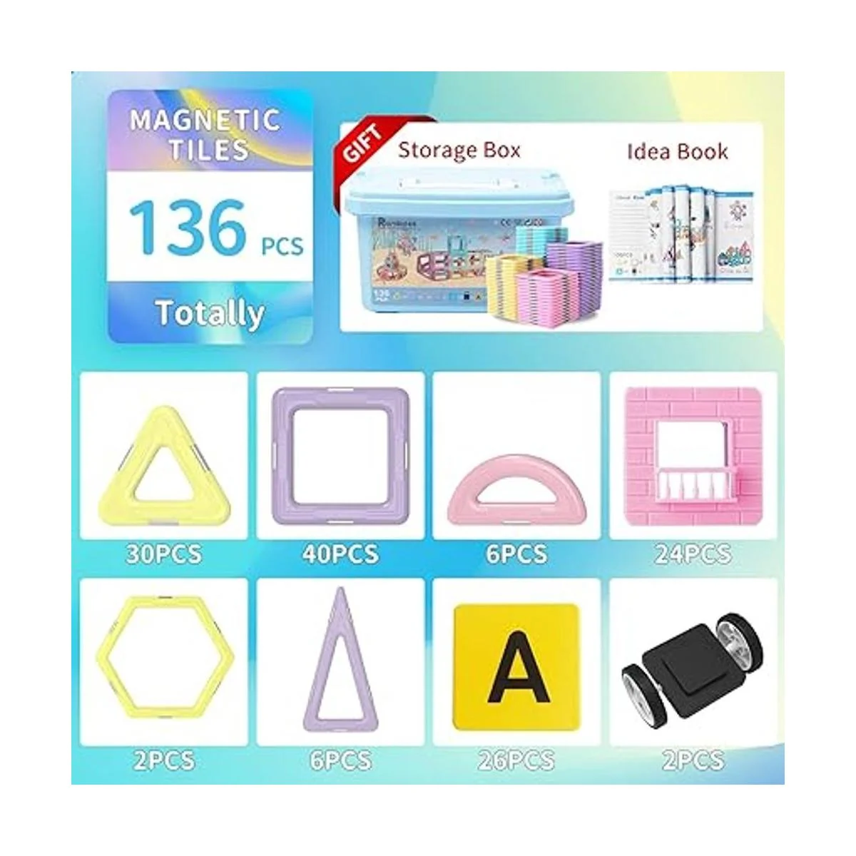 136 piezas en total: este clásico juego de azulejos magnéticos ProGII viene empaquetado en una caja de almacenamiento, incluye 136 piezas de variedad de formas: 40 cuadrados, 30 triángulos, 26 tarjetas de plástico sin magnéticas, 24 tarjetas de castillo sin magnéticas, 6 triángulos isosceles, 6 semicírculos, 2 hexágonos, 2 ruedas sin imán. tic y 1 Libro de juego y aprendizaje.