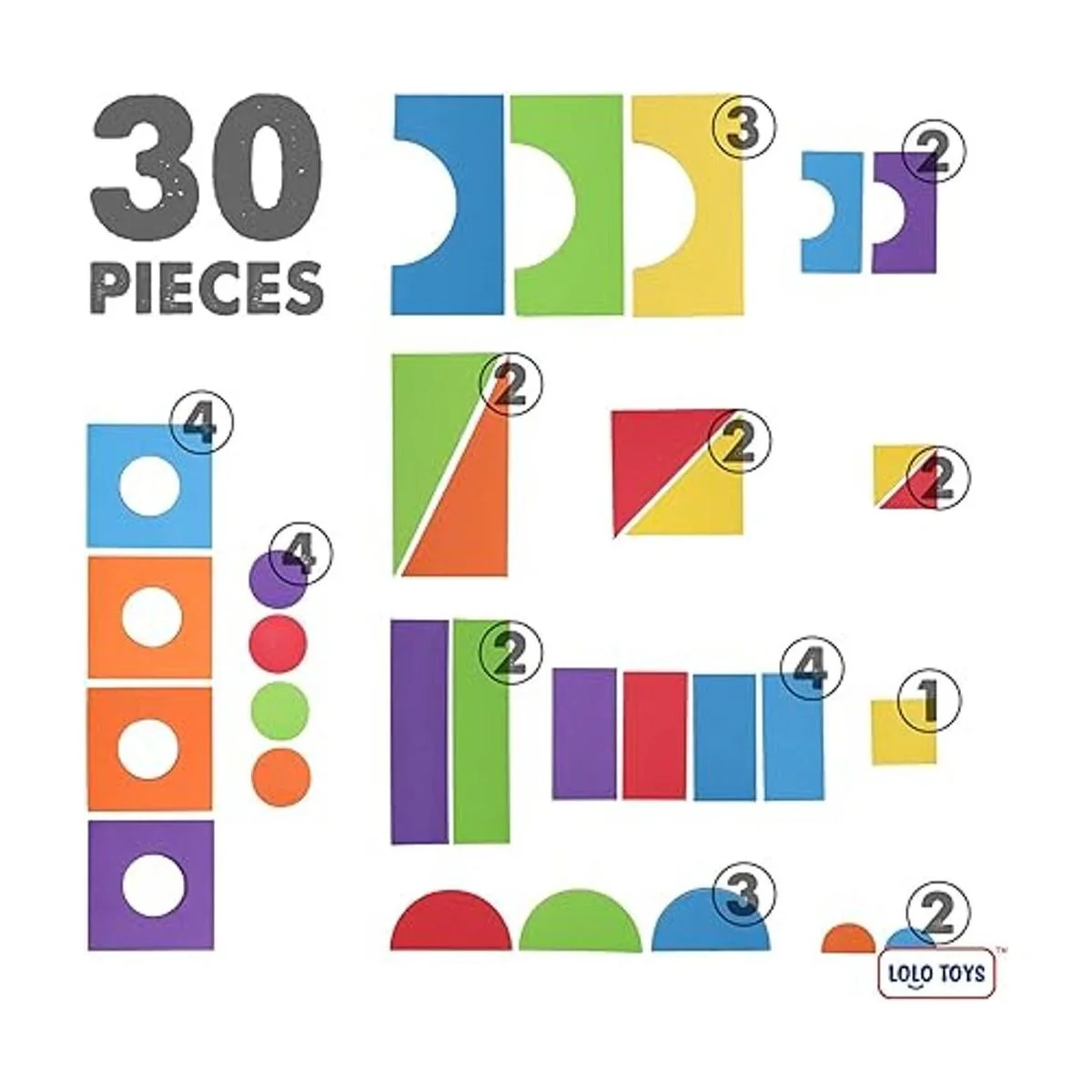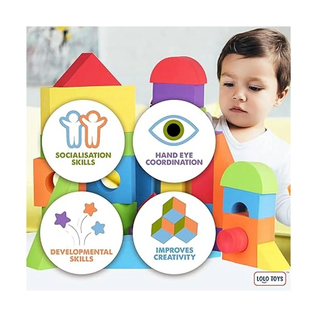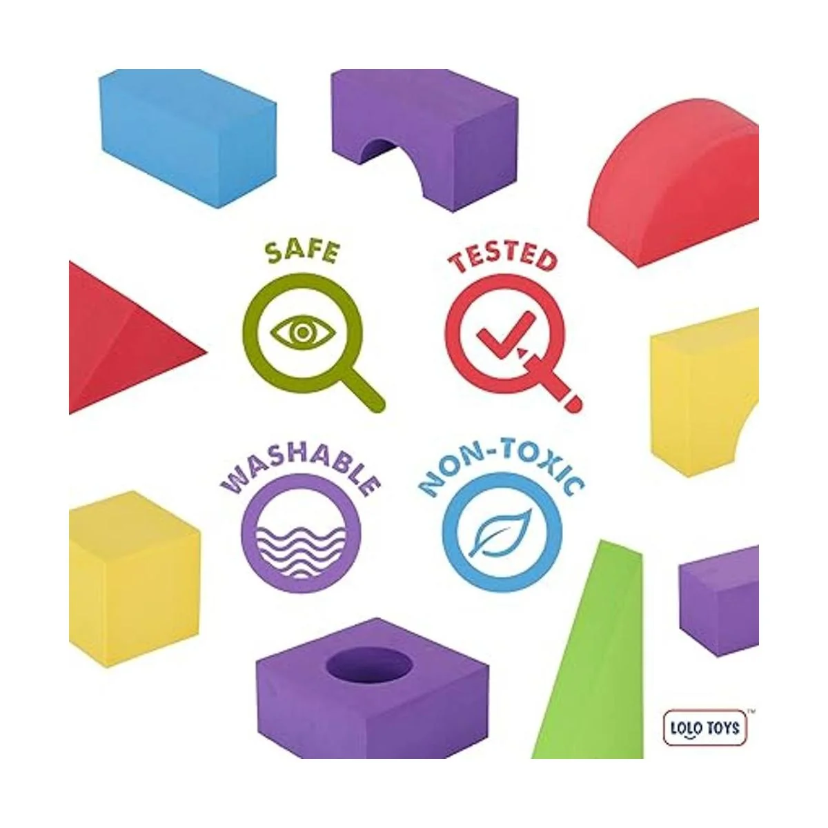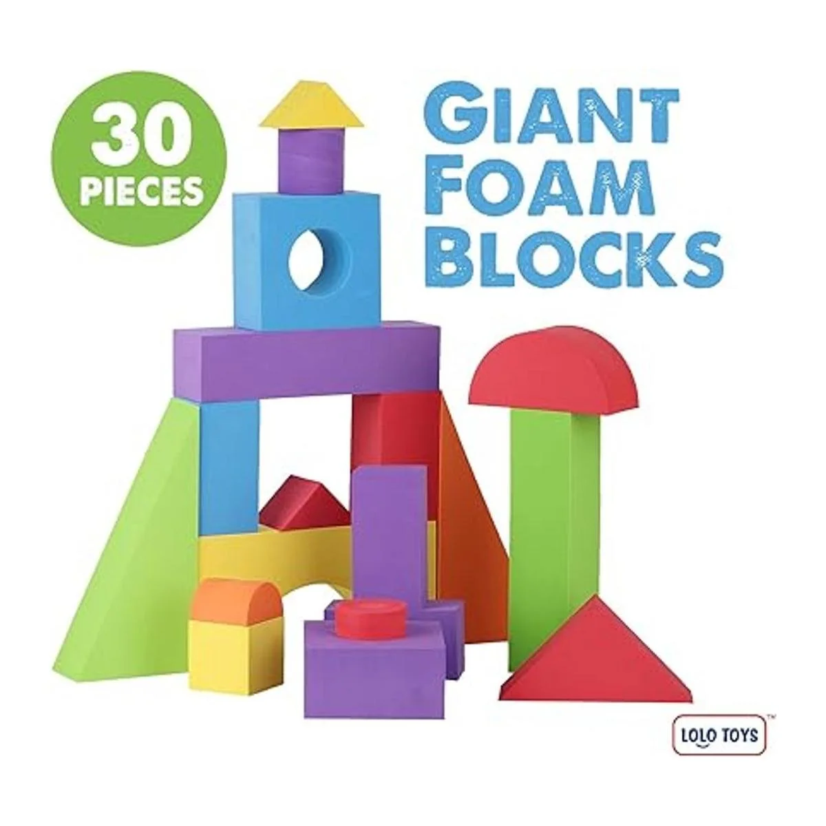 Juego de bloques de construcción grandes de 30 piezas: el juego de bloques de espuma grandes Lolo Toys cuenta con 30 bloques de espuma gigantes para niños en 6 colores diferentes y tamaño ideal para que los niños mejoren las habilidades motoras finas; cada juego de bloques de espuma viene con una bolsa transparente con cremallera para mantener tus bloques jumbo portátiles y perfectamente organizados; estos bloques de espuma jumbo para niños de 1 a 3 años incluyen una variedad de formas y colores para fomentar la imaginación dando a los niños infinitas posibilidades de construcción configuraciones