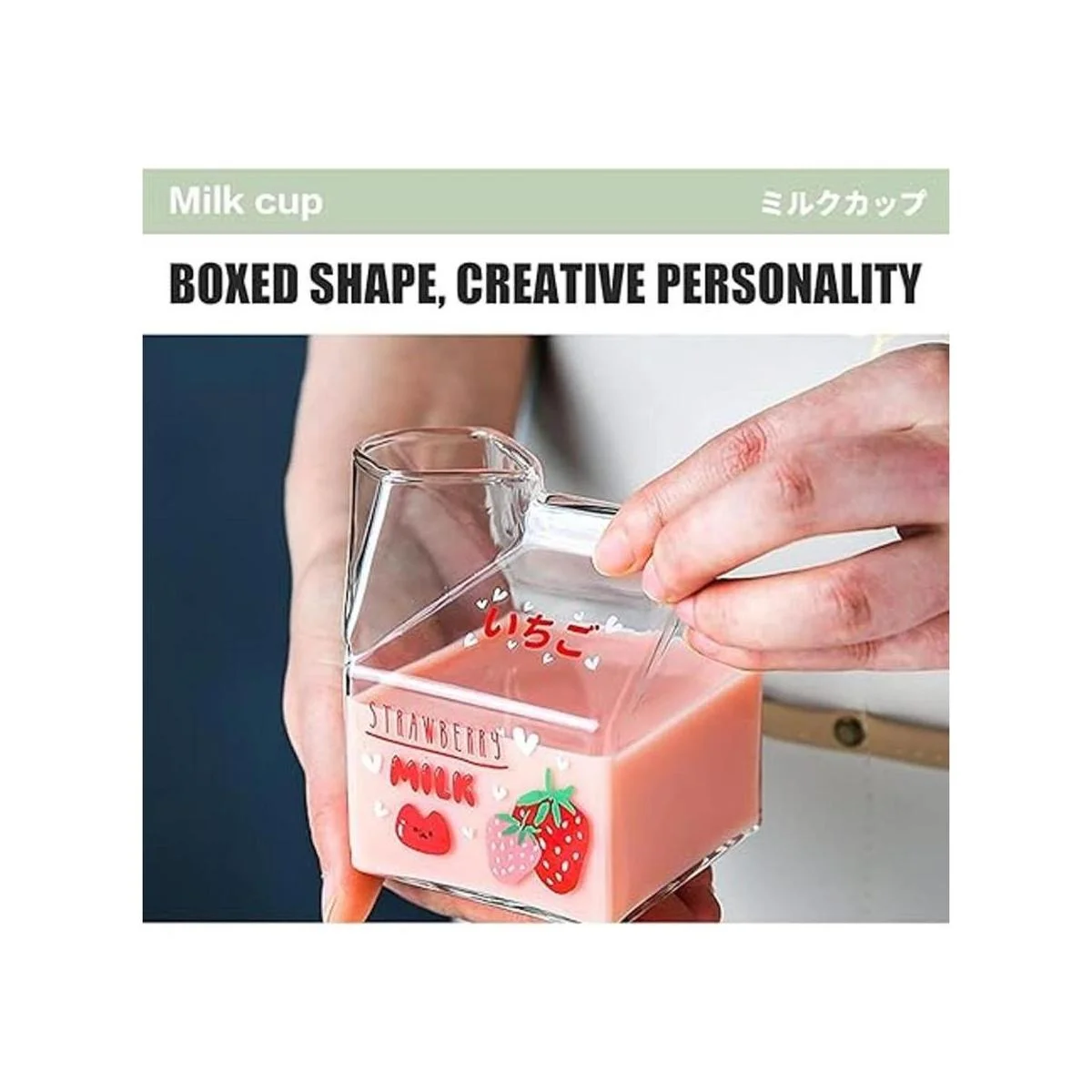 Blsky Kawaii Taza de vidrio para leche para microondas de 12 onzas, bonita taza de leche, mini recipiente para crema de fresa, taza cuadrada para desayuno, jarra de crema de vidrio con caja de regalo fresa
