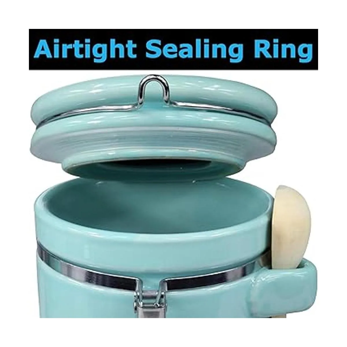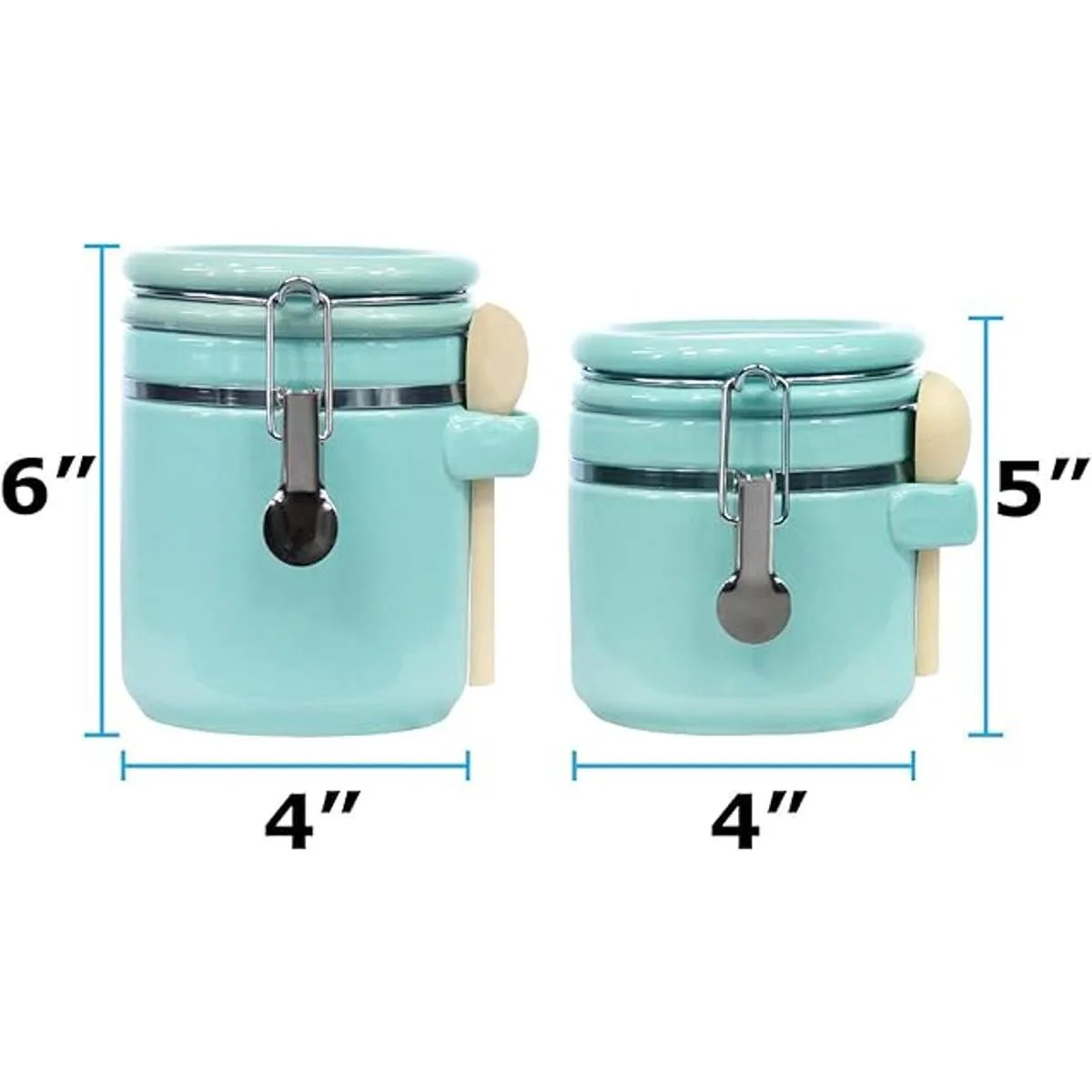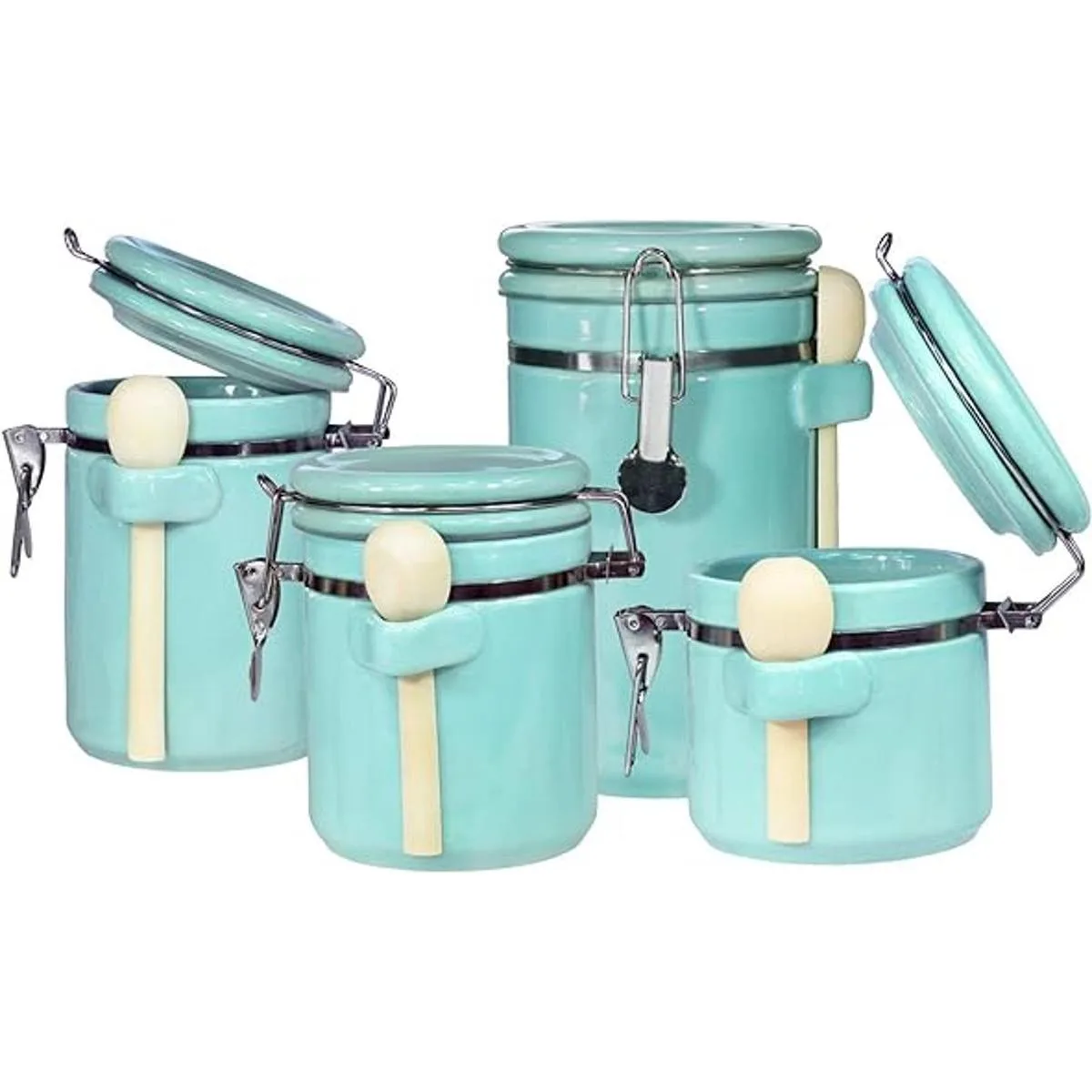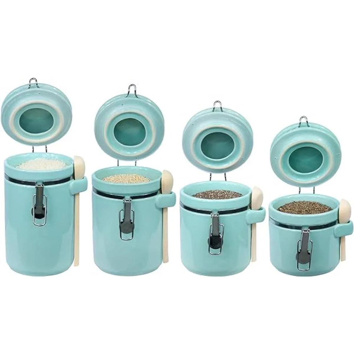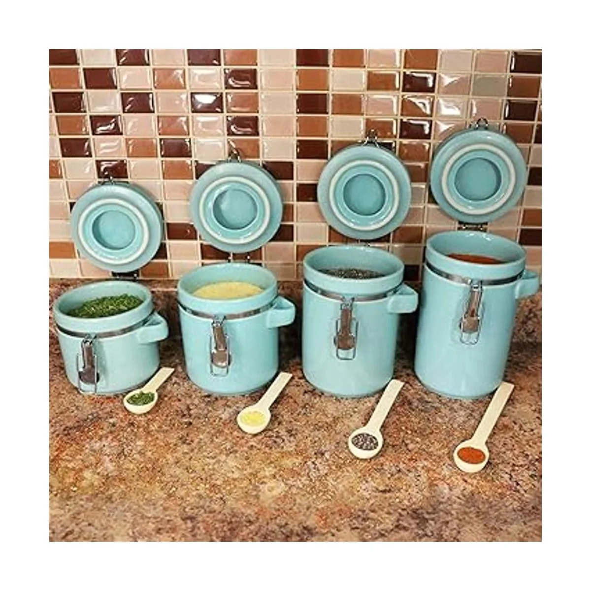 Blue Donuts Juego de 4 botes de cerámica hermética para mostrador de cocina, contenedores de almacenamiento de alimentos, botes de cocina con 4 cucharas de madera, juego de 4 45 oz, 40 oz, 33 oz, 25 oz, turquesa
