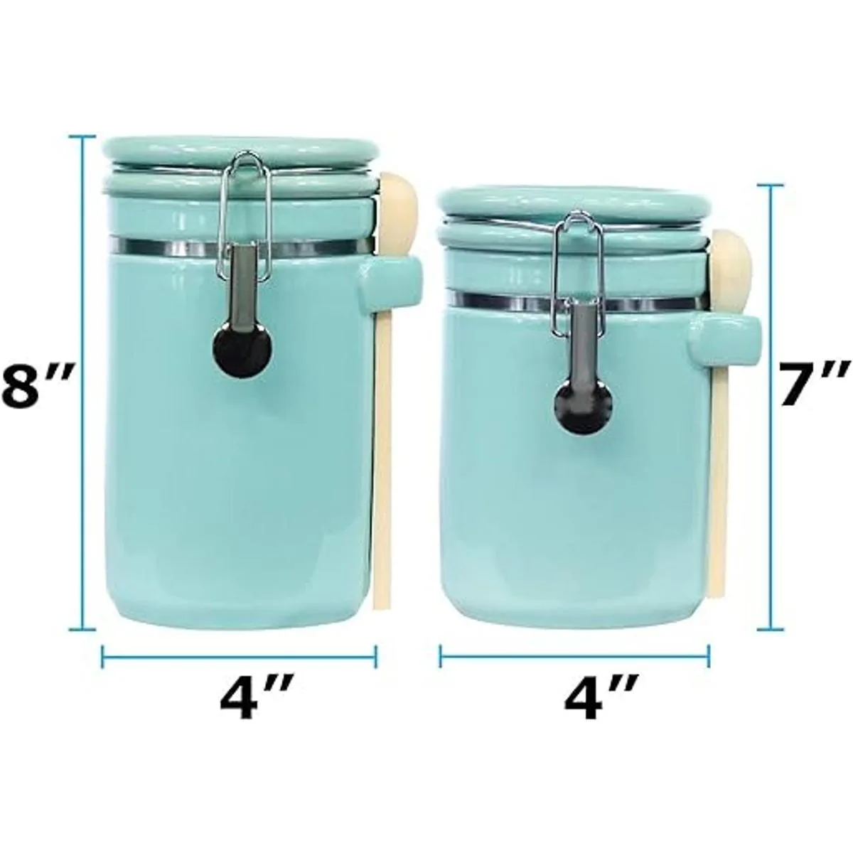 Dimensiones de los recipientes de almacenamiento de alimentos: recipiente de cerámica de 45 onzas de 4,25 pulgadas x 6,75 pulgadas, recipiente de cerámica de 40 onzas de 4,25 pulgadas x 6 pulgadas, recipiente de cerámica de 33 onzas de 4,25 pulgadas x 5,25 pulgadas, recipiente de cerámica de 25 onzas de 4,25 pulgadas x 4 pulgadas, cada recipiente de almacenamiento de alimentos incluye una cuchara de madera, color turquesa
