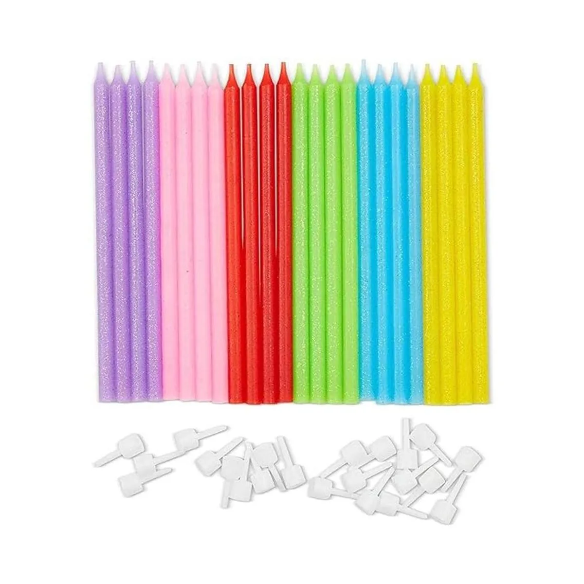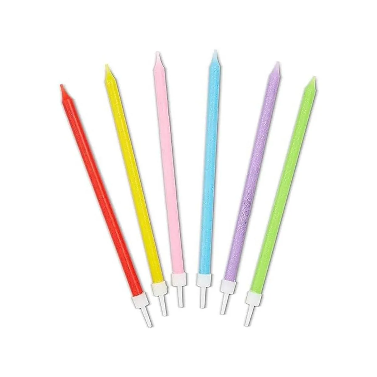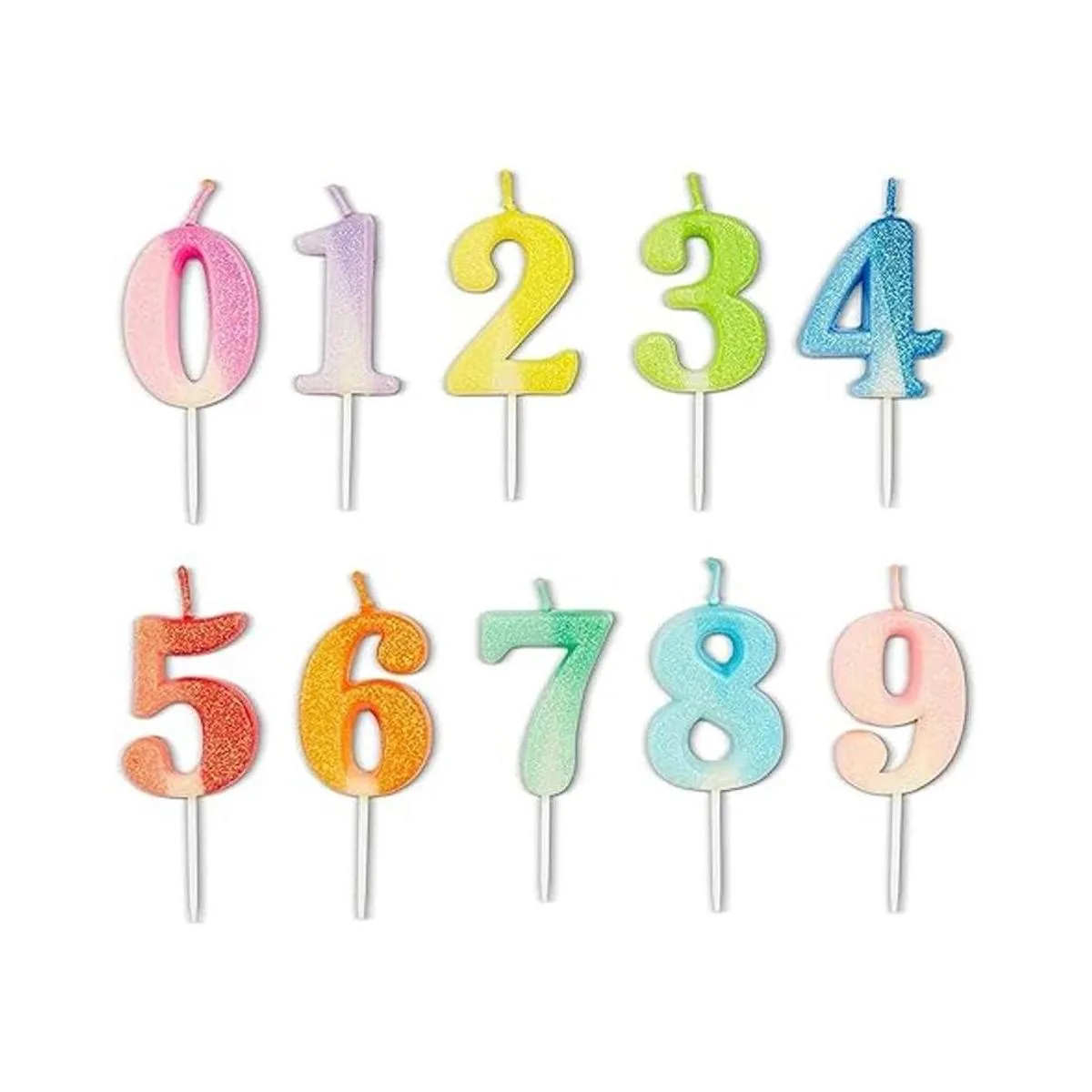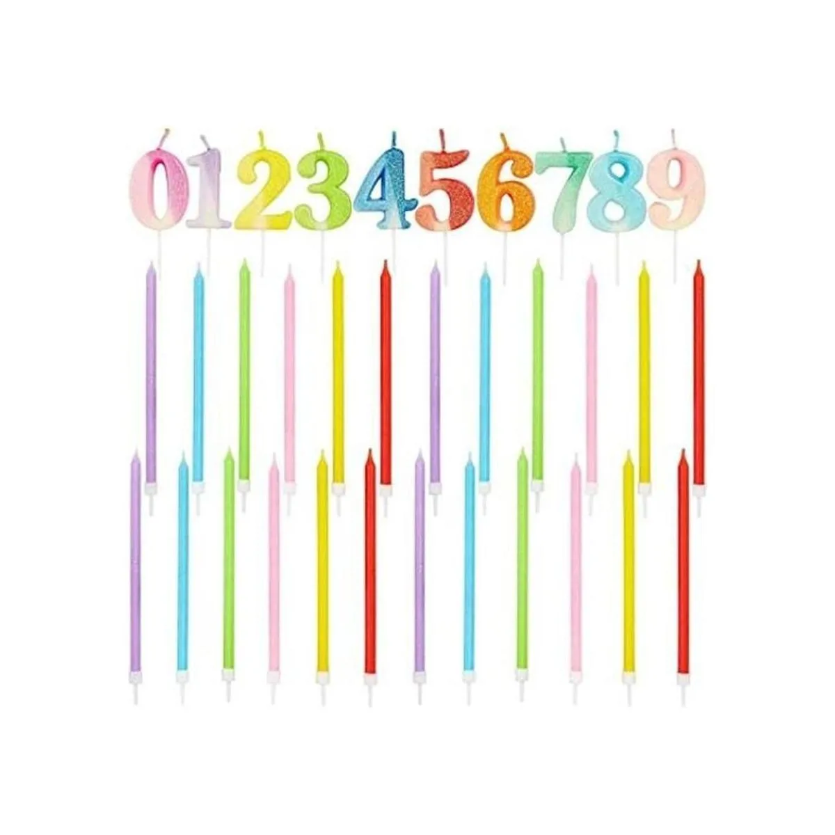 Incluye 0 9 velas de número y 24 velas finas de alto en varios colores de neón con purpurina.