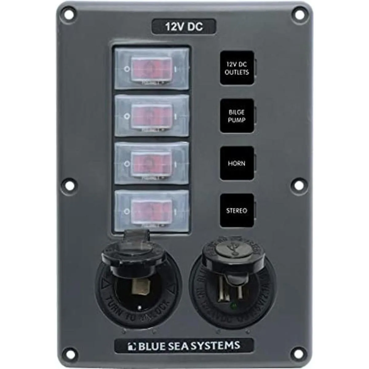 Blue Sea Systems WaterResistant Circuit Breaker Panel, 4 Position 12V Socket Dual USB Charger Gray.Nominal Voltage: 12V DC, Max Op. Amp: 45A, Term. Type: 1/4 Male Quick Connect, Hardware: SS 6 x 5/8 mounting screws, Ring Terminal Size: M5 10.