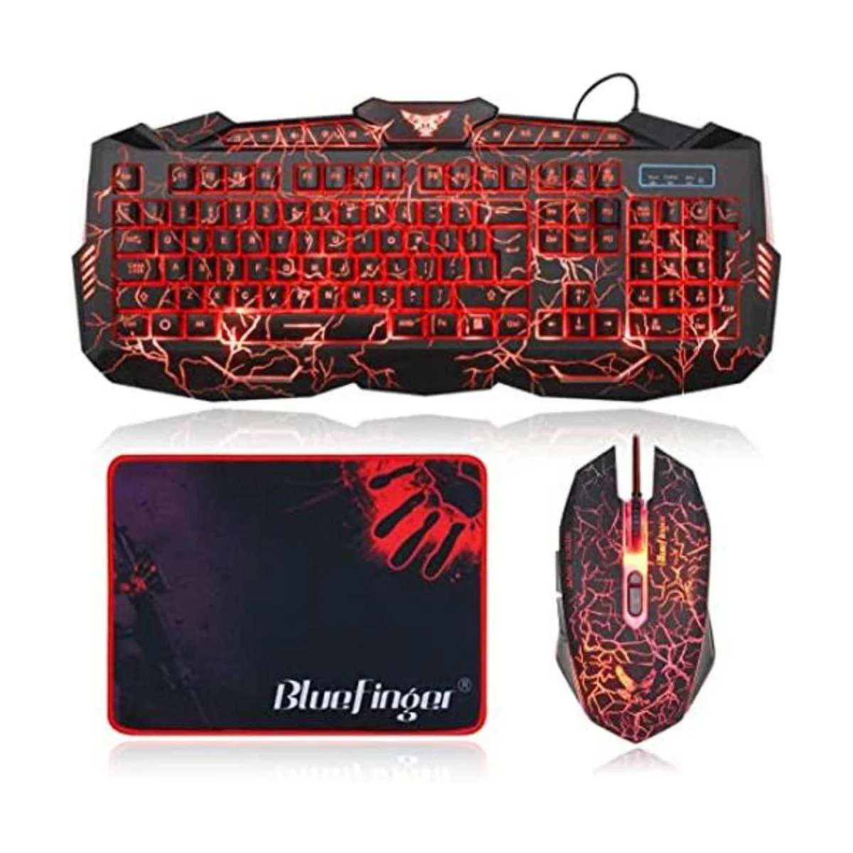 BlueFinger Combo de teclado y mouse retroiluminado para juegos, juego de teclado retroiluminado con cable USB, teclas multimedia, teclado de iluminación LED de 3 colores para juegos y trabajo