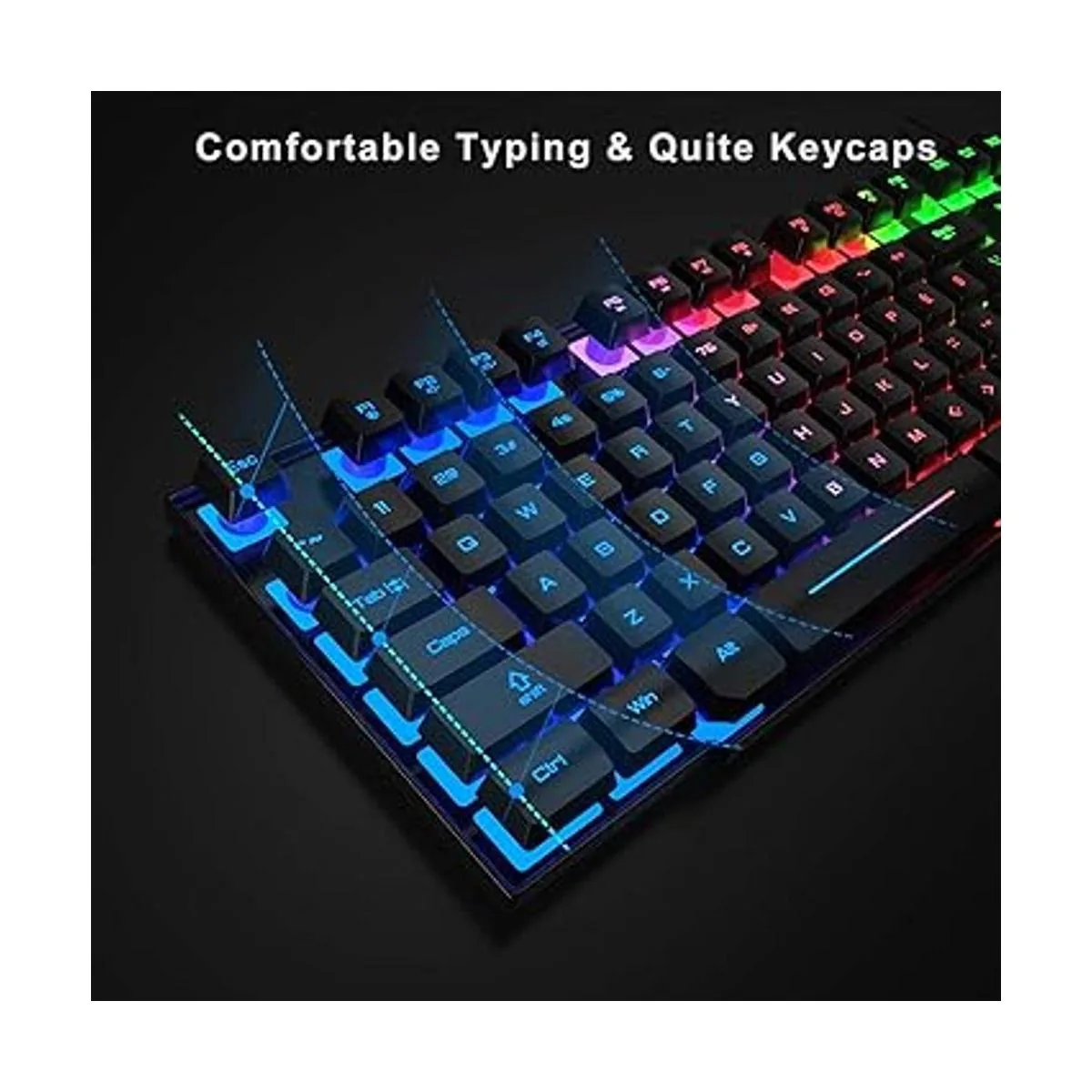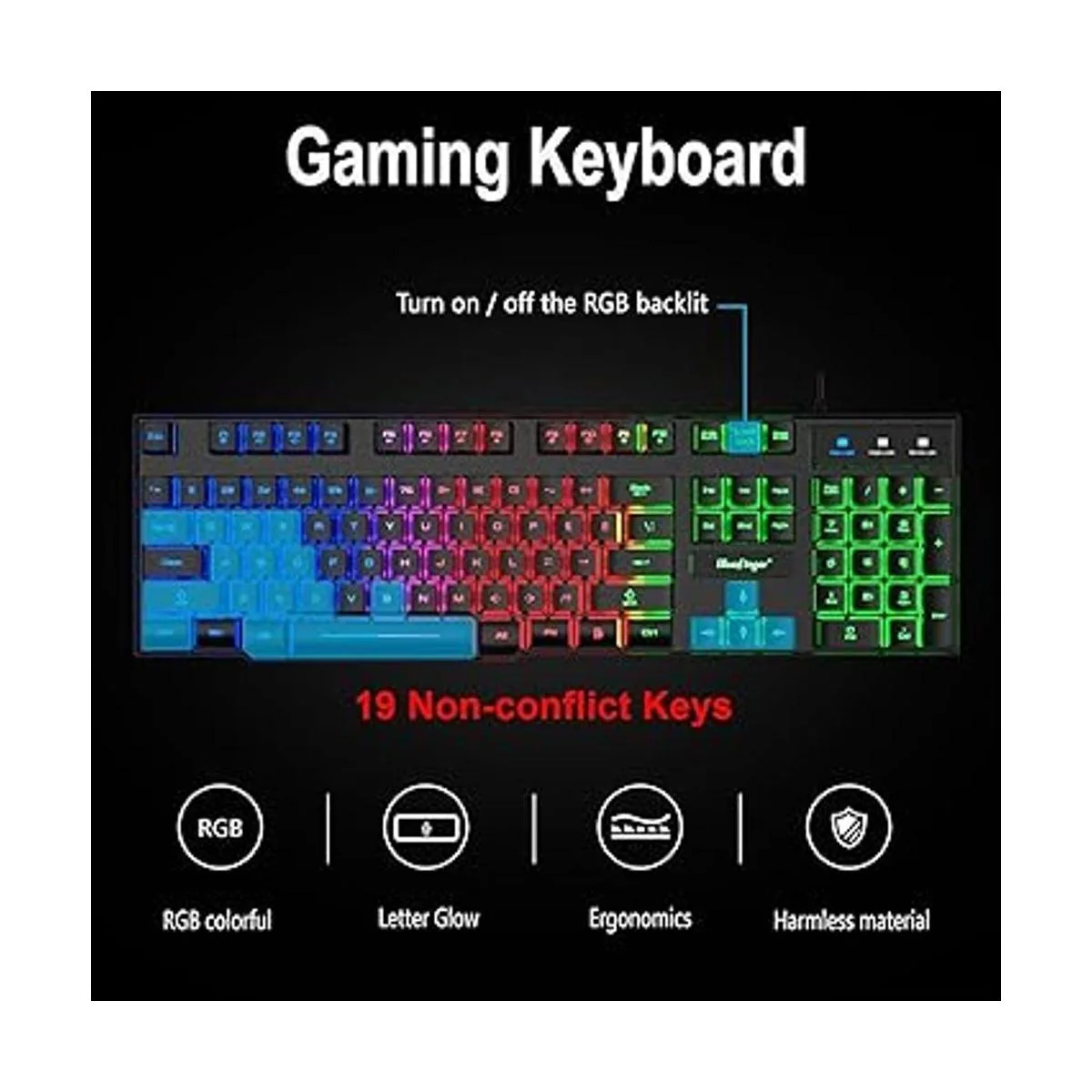 Teclado para juegos: tecla de bloqueo de desplazamiento: enciende y apaga la retroiluminación RGB. El teclado de 104 teclas tiene función de retroiluminación RGB; todas las letras brillan y nunca se desvanecen. Este teclado tiene placa de acero integrada, anticaídas; cable trenzado USB duradero de 61 pulgadas. 19 teclas sin conflicto te permiten presionar o sostener varias teclas simultáneamente.