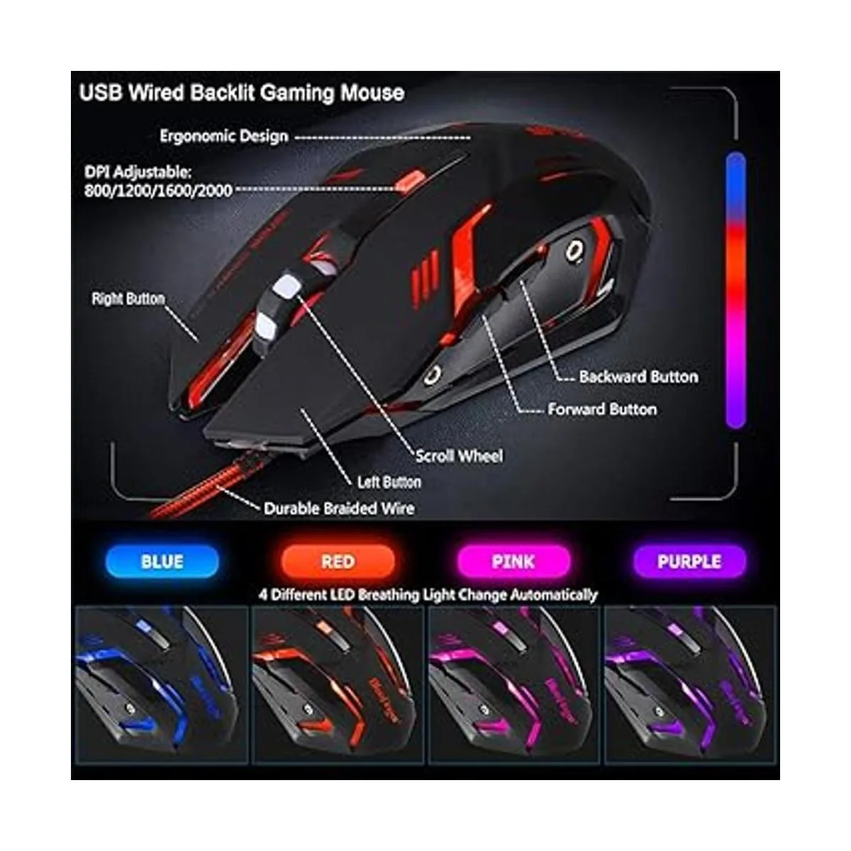 Ratón para juegos: diseño ergonómico y construcción ABS de calidad; cable trenzado USB duradero de 59 pulgadas; 4 luces LED diferentes que cambian automáticamente; DPI ajustable: 800/1200/1600/2000; tecla hacia adelante tecla DPI: enciende y apaga la retroiluminación del mouse.