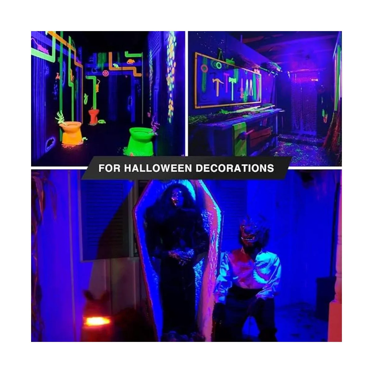 Bombillas de luz negra. Los rayos de las bombillas LED negras emiten un hermoso brillo de neón cuando se dirigen a ciertos objetos de colores, lo que las hace perfectas para efectos de iluminación decorativos y artísticos para crear un ambiente visualmente dramático.