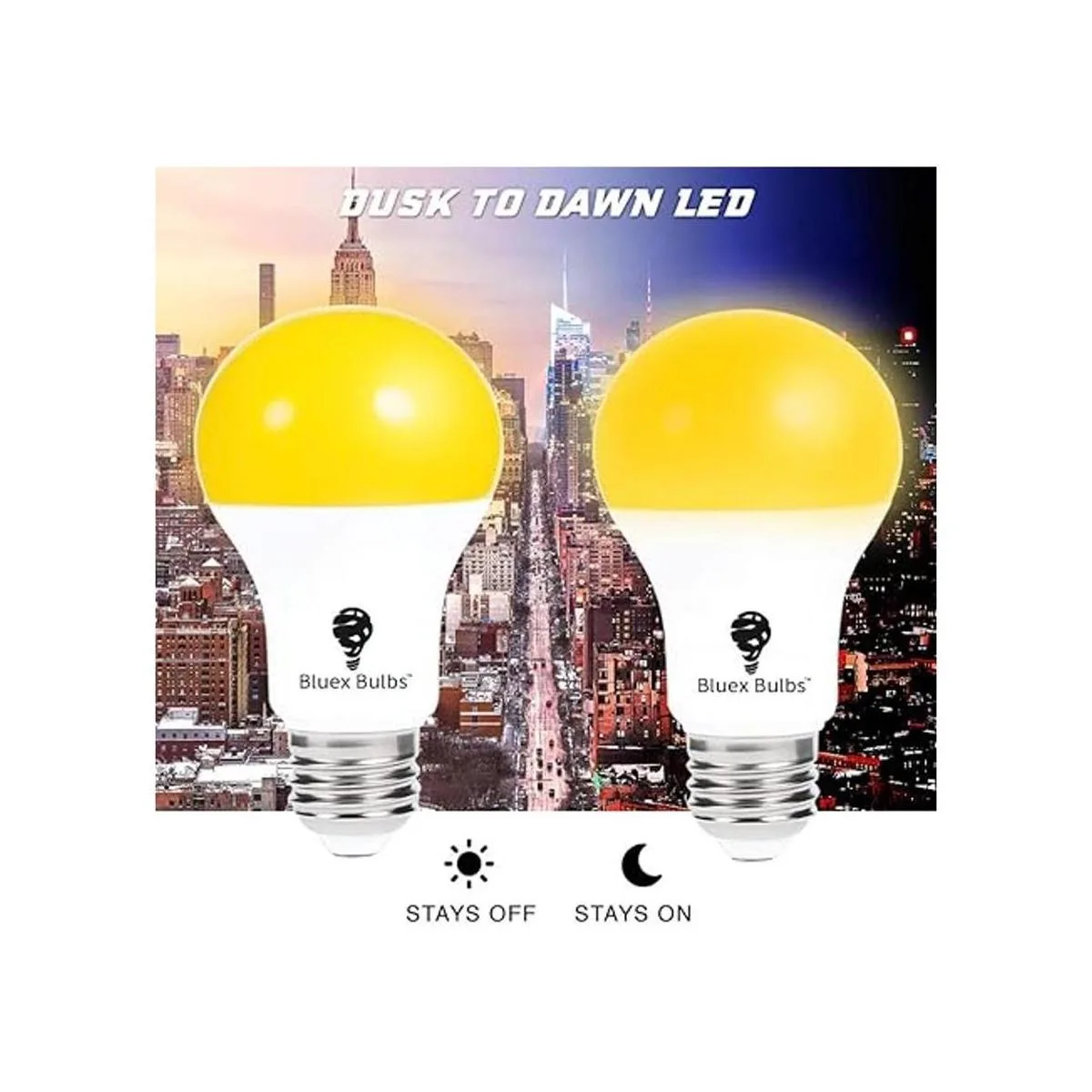 Bluex Paquete de 2 bombillas LED para insectos A19 del atardecer al amanecer, bombilla amarilla, luz ámbar con sensor automático, luces LED de porche de seguridad para exteriores, encendido automático, 2000K E26, 500 lúmenes