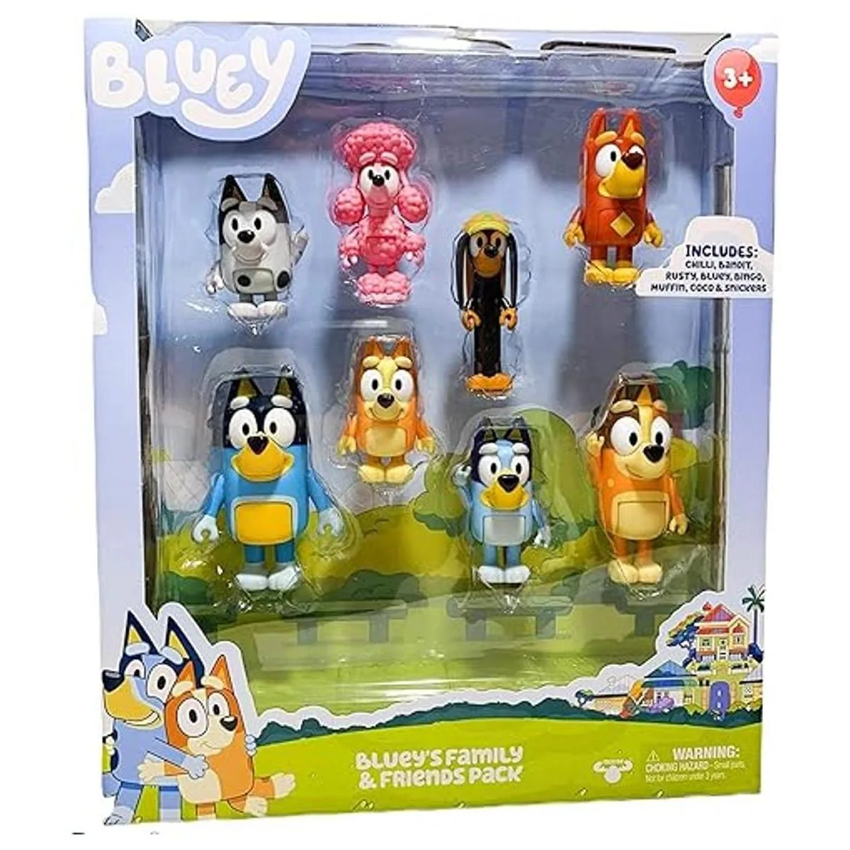 Incluye los cuatro miembros de la familia Bluey: Bluey, Bingo, Bandit Dad y Chilli mamá. Además de 4 amigos de Bluey y Bingo: Coco, Snickers, Rusty y Muffin