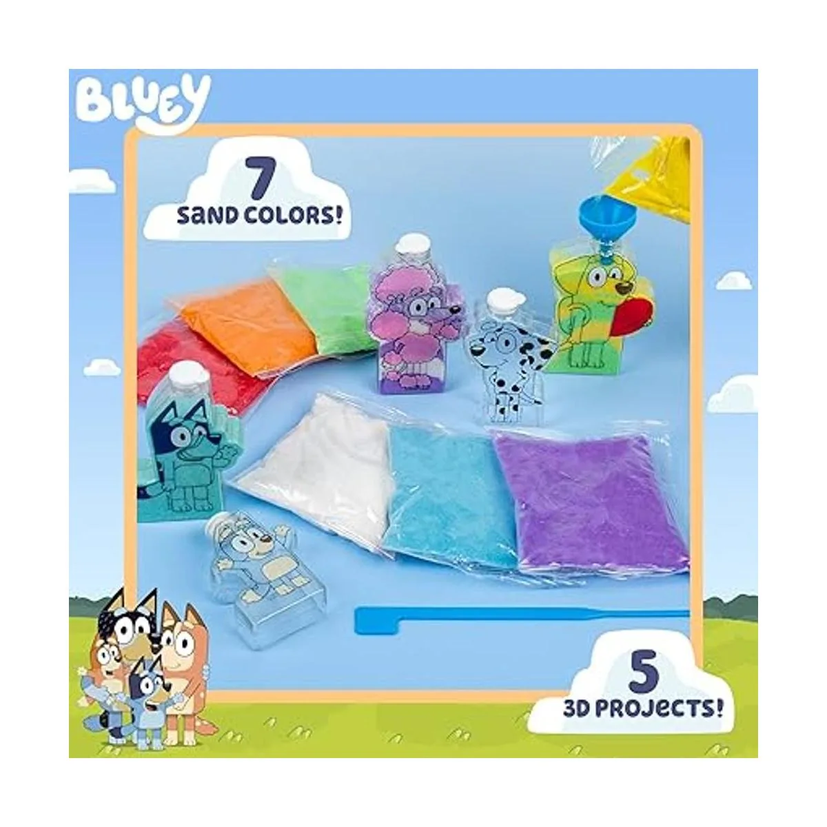 Dale vida a tus amigos azules favoritos: Bluey, Bingo, Coco, Lucky, Chloe: este kit de arte de arena viene con 5 botellas divertidas de todos tus personajes favoritos