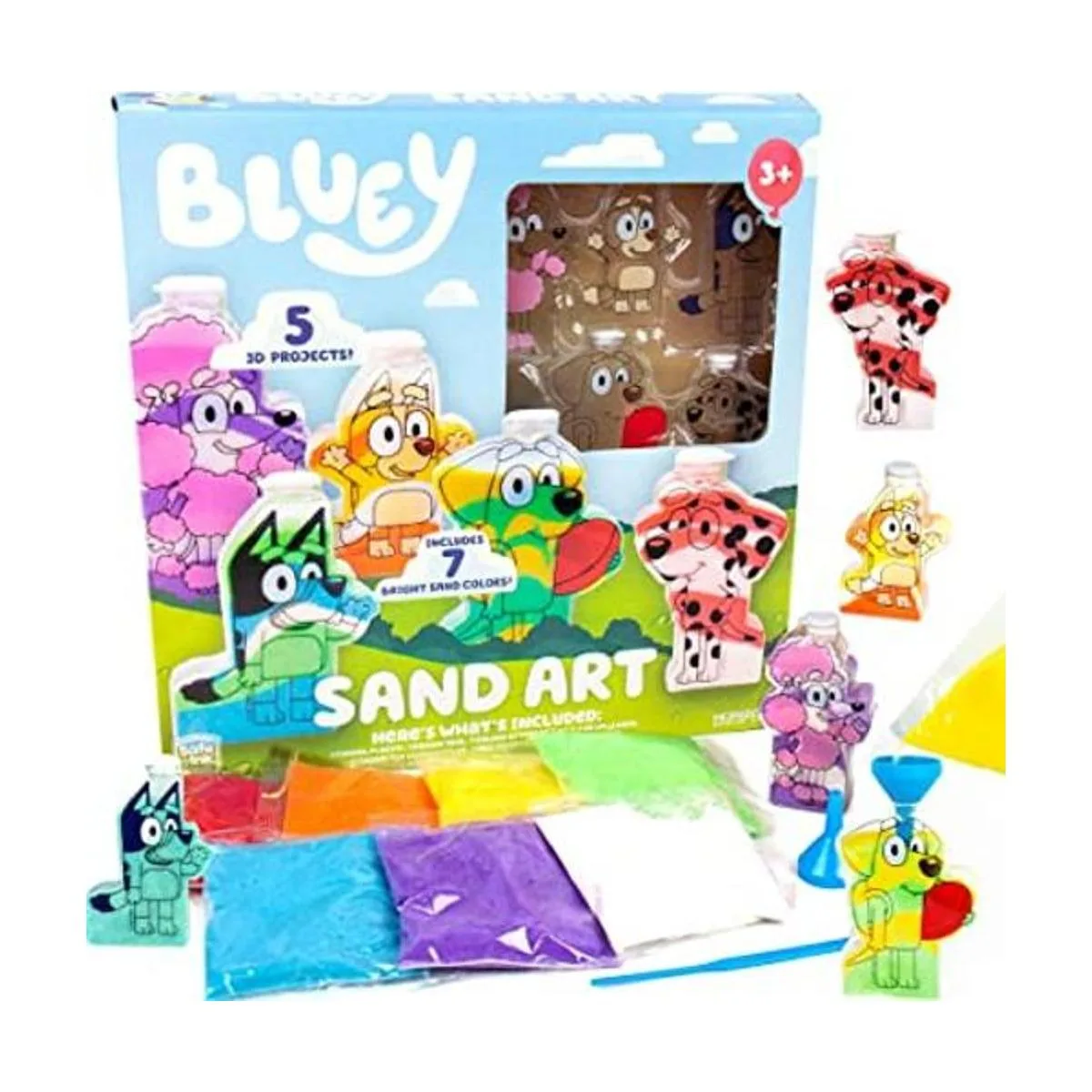 Bluey Sand Art, crea tu propio kit de arte de arena de bingo, incluye 5 botellas de arte de arena y 7 colores de arena fresca, suministros de fiesta de cumpleaños Bluey, figuras azules, figuras de juguete y juegos, juguetes y juegos, a partir de 3 años