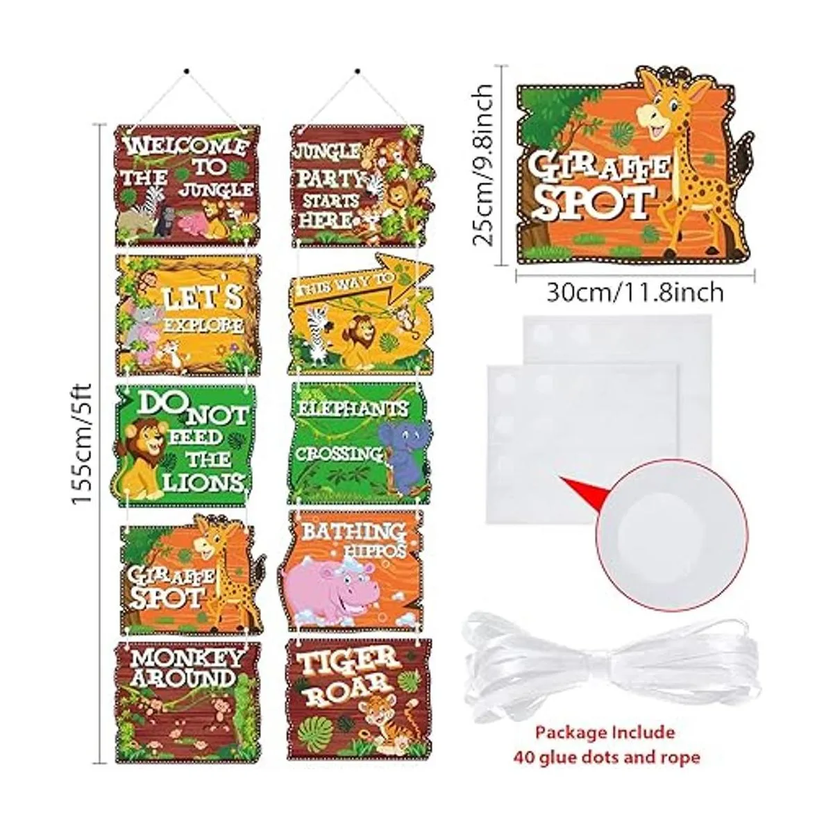 El paquete incluye: 10 recortes de letreros de animales de la selva, el tamaño de cada tarjeta es de 11.8 x 9.8 in; 2 cuerdas que la longitud de cada una es de 13.1 ft/13.12 pies; 40 puntos de pegamento sin rastro; el cartel de animal es lo suficientemente grande como para decorar tu fiesta, impresionar a tu familia y dar vida a tu fiesta
