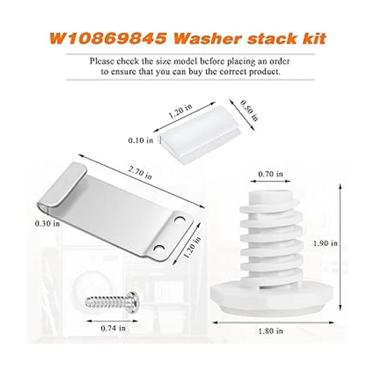 Kit de apilamiento W10869845: incluye 4 patas de arandela, 4 tornillos de cabeza plana, 2 clips de plástico, 2 soportes de gancho, 1 especificación. El kit W10869845 incluye todo lo que necesitas para apilar de forma segura y rápida tu secadora en la parte superior de tu lavadora. El kit apilable W10869845 está hecho de material duradero de alta calidad para garantizar un rendimiento duradero y eficaz y proporcionar un fuerte apoyo para la instalación.