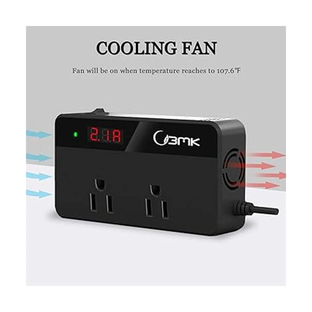 Ventilador de refrigeración silencioso e indicador LED: el adaptador de salida de CA BMK integrado en ventilador de refrigeración inteligente, hace que el inversor de potencia del coche sea silencioso cuando se opera, y funciona más rápido cuando se calienta. El indicador LED muestra el estado de funcionamiento: funcionamiento verde, apagado rojo