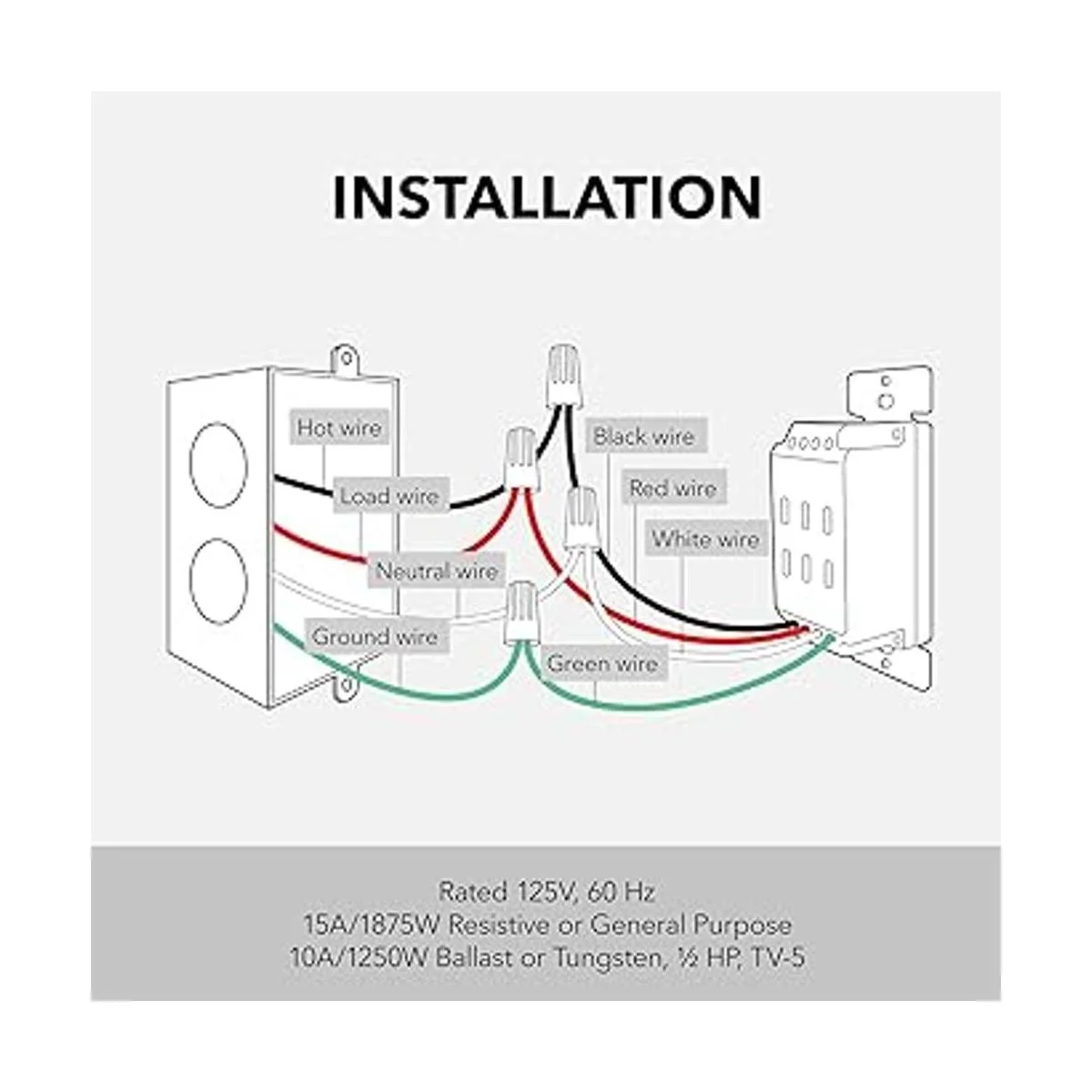 Seguro y fiable: listado ETL y cumple con UL Std. 607301, 6073027. Clasificado 125 V, 60 Hz, 15 A/1875 W resistente o de uso general, balasto o tungsteno de 10 A/1250 W, HP, TV5. Se requiere cable neutro.