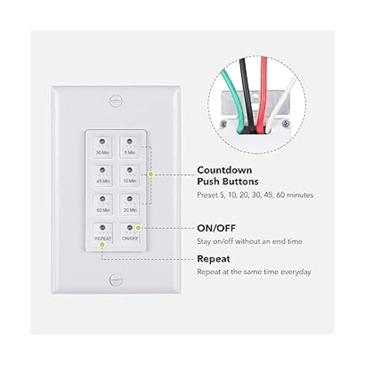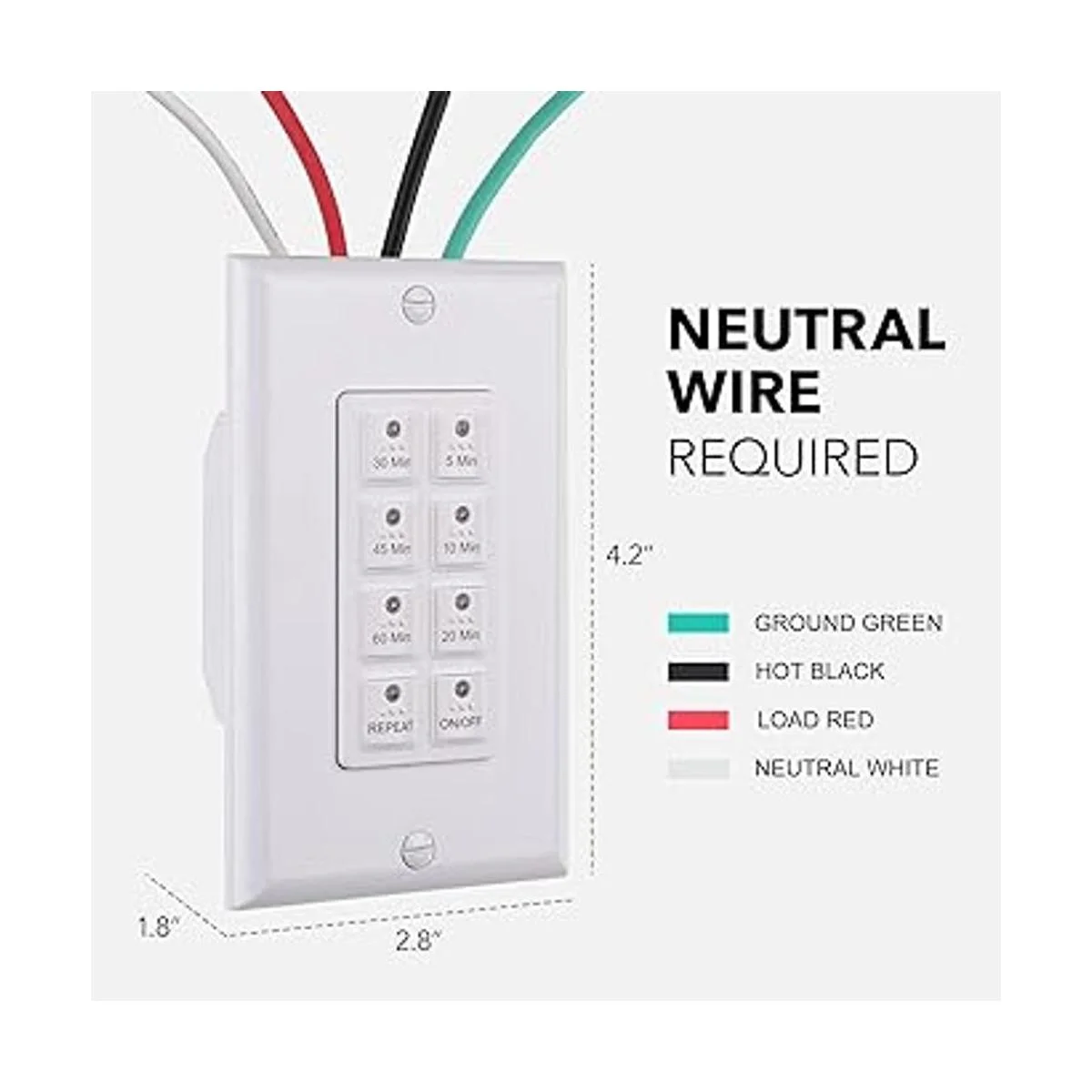 BNLINK Interruptor de temporizador digital de cuenta regresiva en la pared con botón pulsador de 51020304560 minutos, para ventilador de baño, temporizador de luz en la pared, requiere neutro, placa libre, blanco