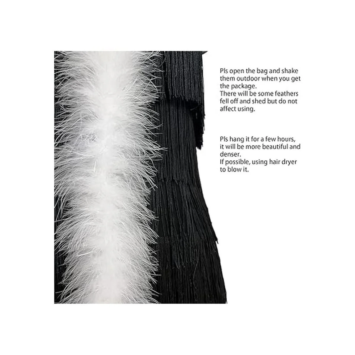 Antes de usar, agita la pluma extra al aire libre. Dado que nuestras plumas son naturales y hechas a mano, puede haber gotas de plumas, pero no afectará tu uso.