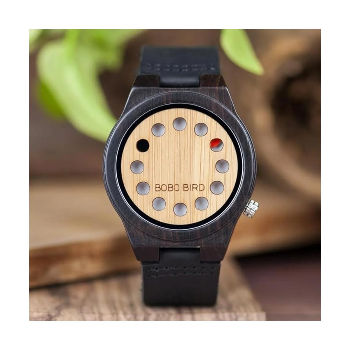 BOBO BIRD Reloj de madera de bambú para hombre con correa de piel de vaca en color negro, temporizador de 12 agujeros, diseño deportivo, uso casual