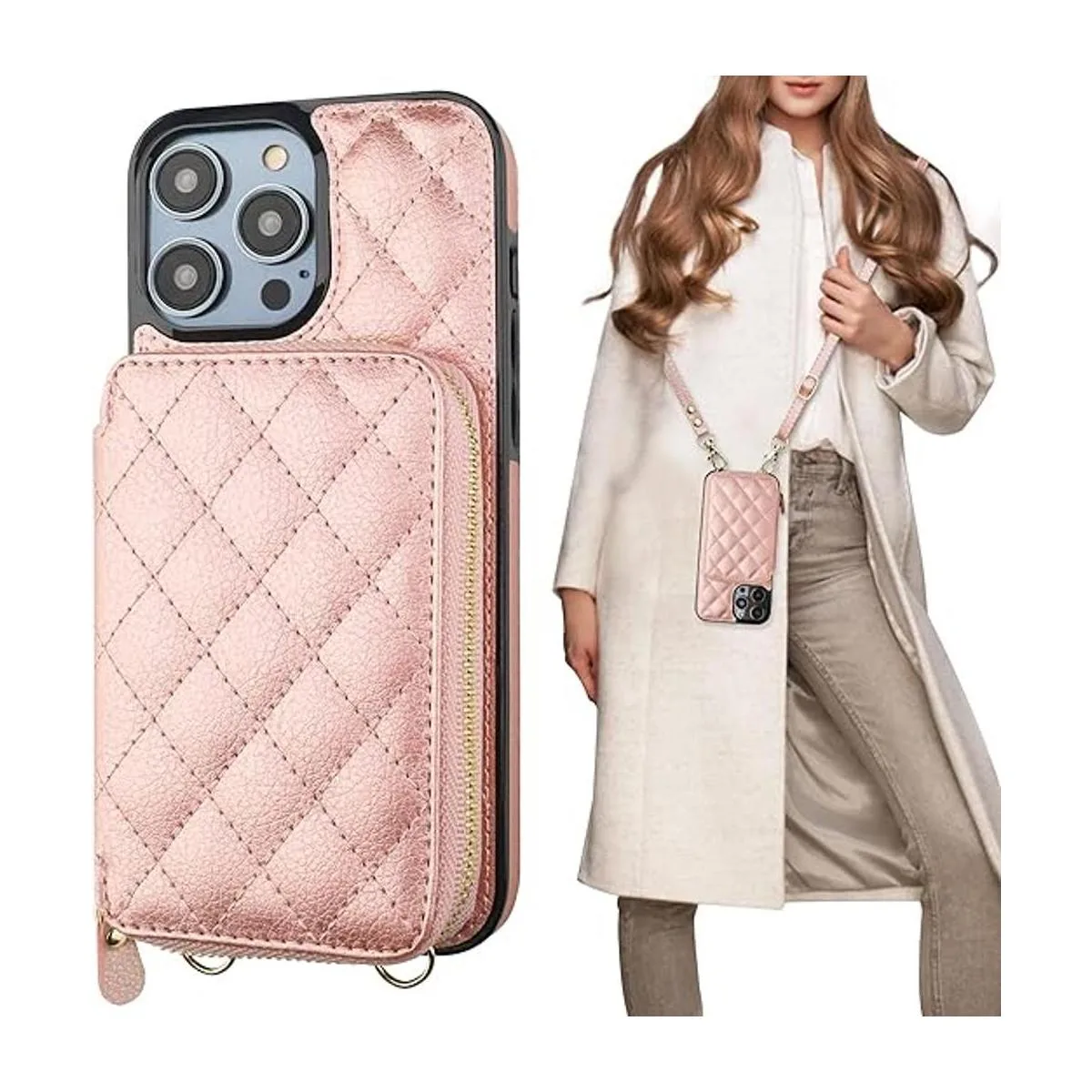 Bocasal Funda tipo cartera cruzada para iPhone 14 Pro Max, con bloqueo RFID, de piel sintética, con cremallera, funda tipo cartera con soporte para tarjetas, correa de muñeca 5G, 6.7 pulgadas oro rosa