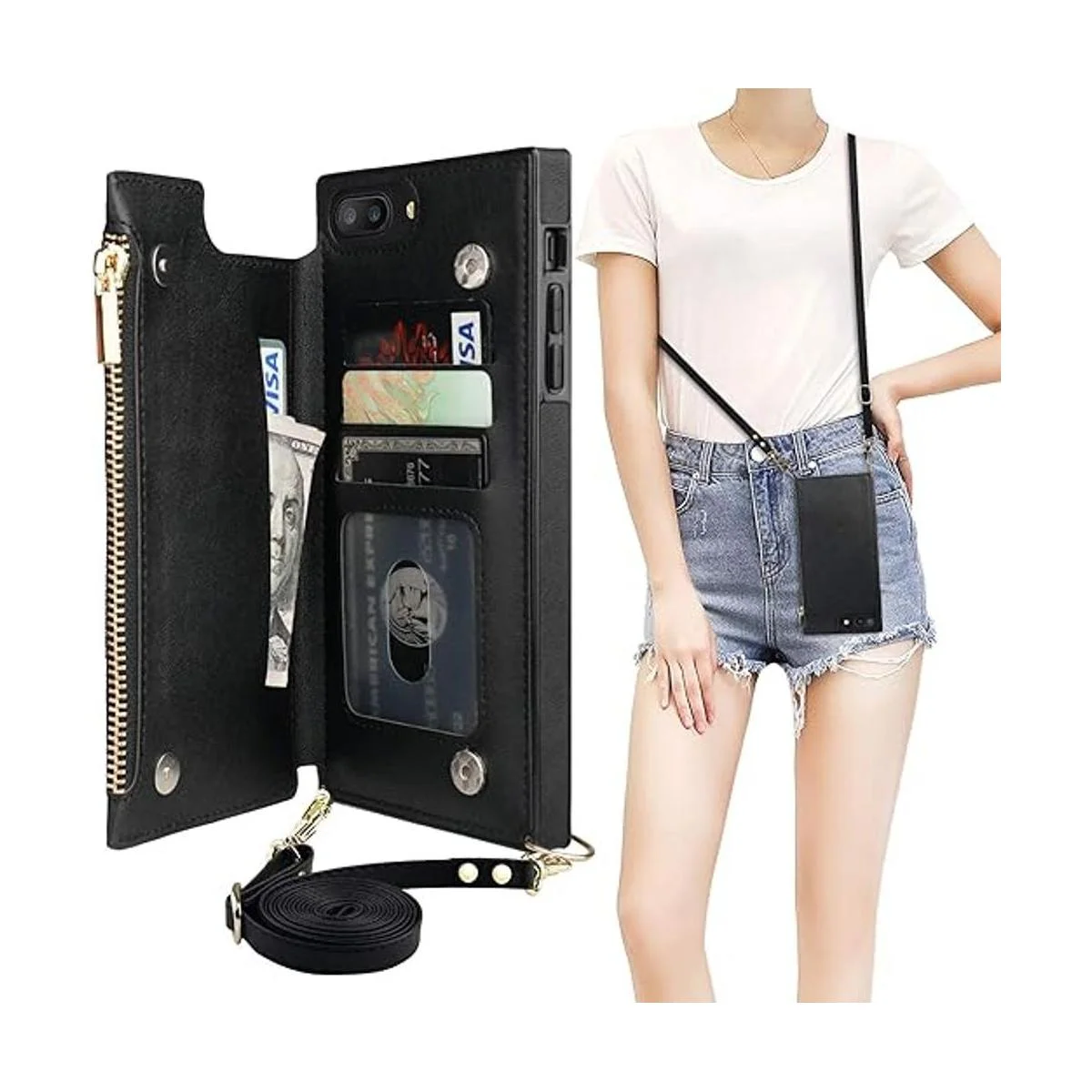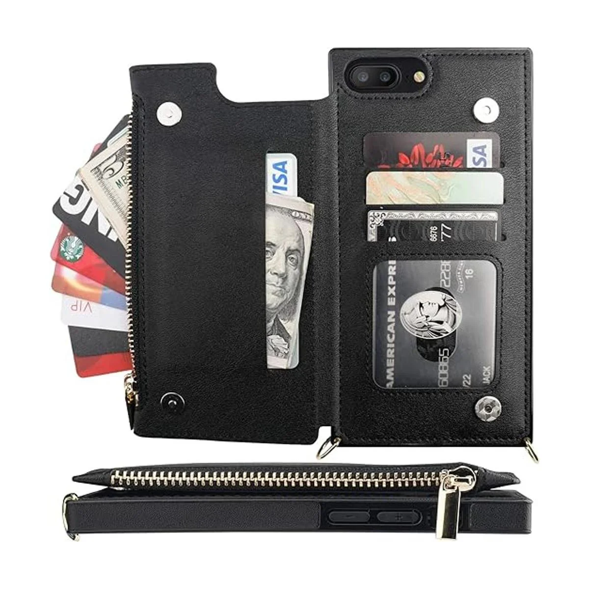 Bocasal Funda tipo cartera cruzada para iPhone 7 Plus8 Plus con soporte para tarjetas, protector de ranura para tarjetas con cremallera, funda de bolso a prueba de golpes, con correa cruzada extraíble de 5.5 pulgadas negro