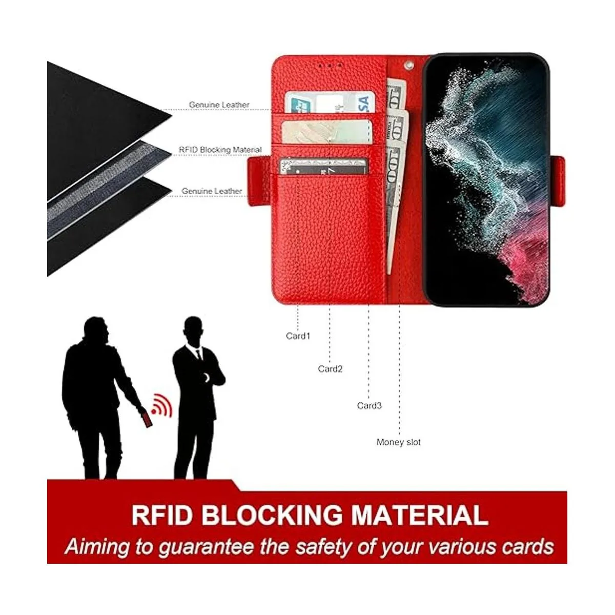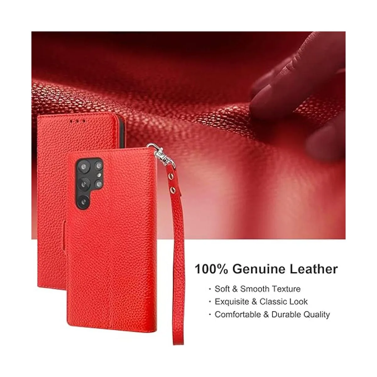Bocasal Funda tipo cartera para Galaxy S22 Ultra 5G, soporte de cuero auténtico, carga inalámbrica, bloqueo RFID, soporte con ranuras para tarjetas, funda magnética con correa de muñeca de 6.8 pulgadas rojo