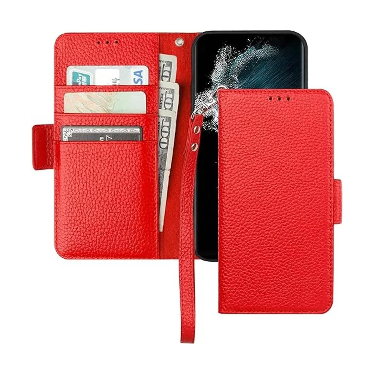 Cartera de piel auténtica: cuero genuino con patrón de lichi se selecciona por calidad, carácter, grano y textura. Es más suave en textura que la piel sintética. Equipado con una muñeca desmontable de cuero real, esta funda folio se puede llevar de dos maneras.