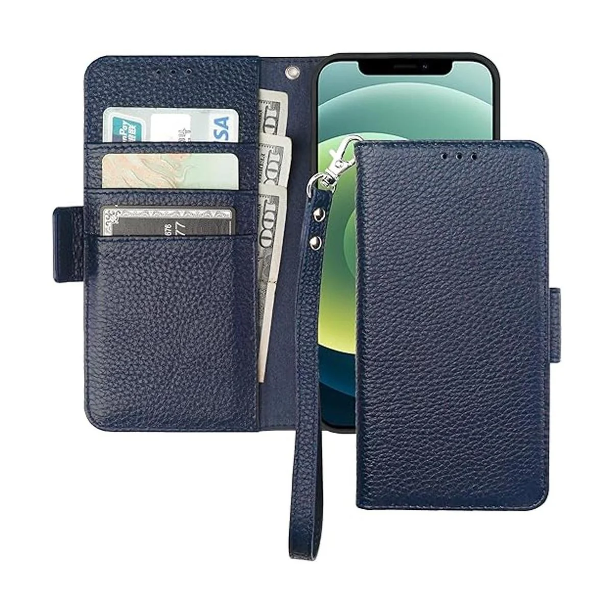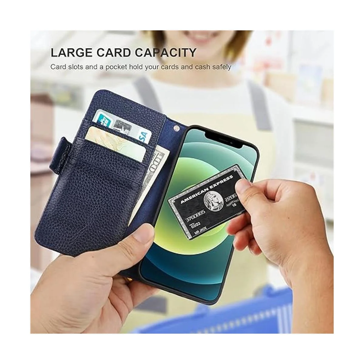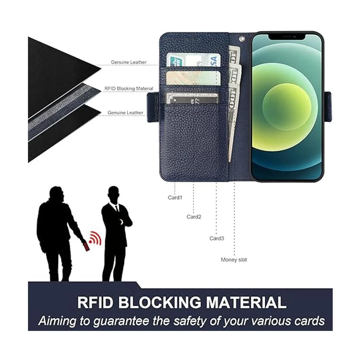 Bocasal Funda tipo cartera para iPhone 1212 Pro, soporte de piel auténtica, carga inalámbrica, bloqueo RFID, soporte para ranuras para tarjetas, soporte plegable de libro con correa de muñeca de 6.1 pulgadas azul oscuro