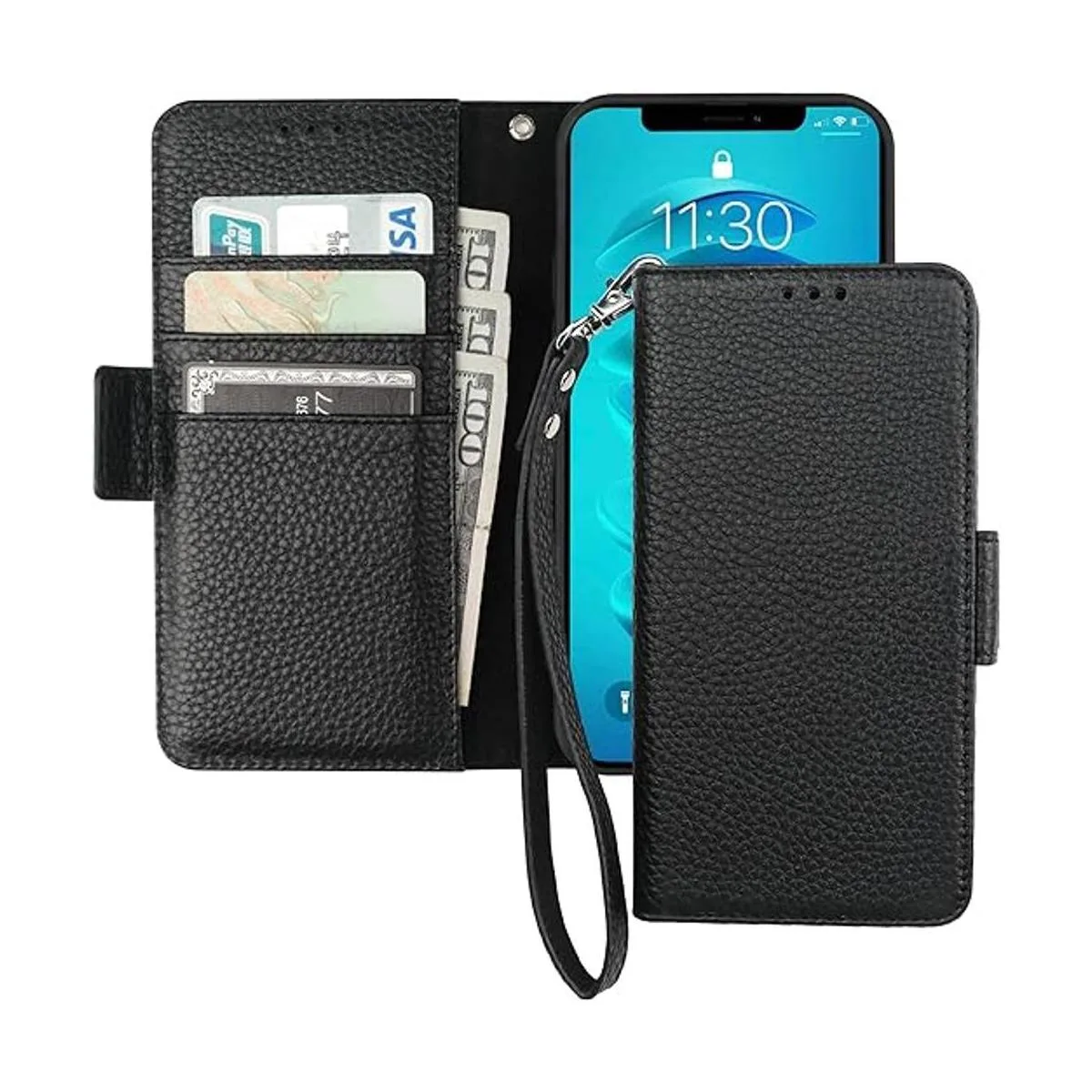 Cartera de piel auténtica: piel auténtica con patrón de lichi seleccionado por calidad, carácter, grano y textura. Es más suave en textura que la piel sintética. Equipado con una pulsera desmontable de piel auténtica, esta funda con tapa se puede llevar de dos maneras.