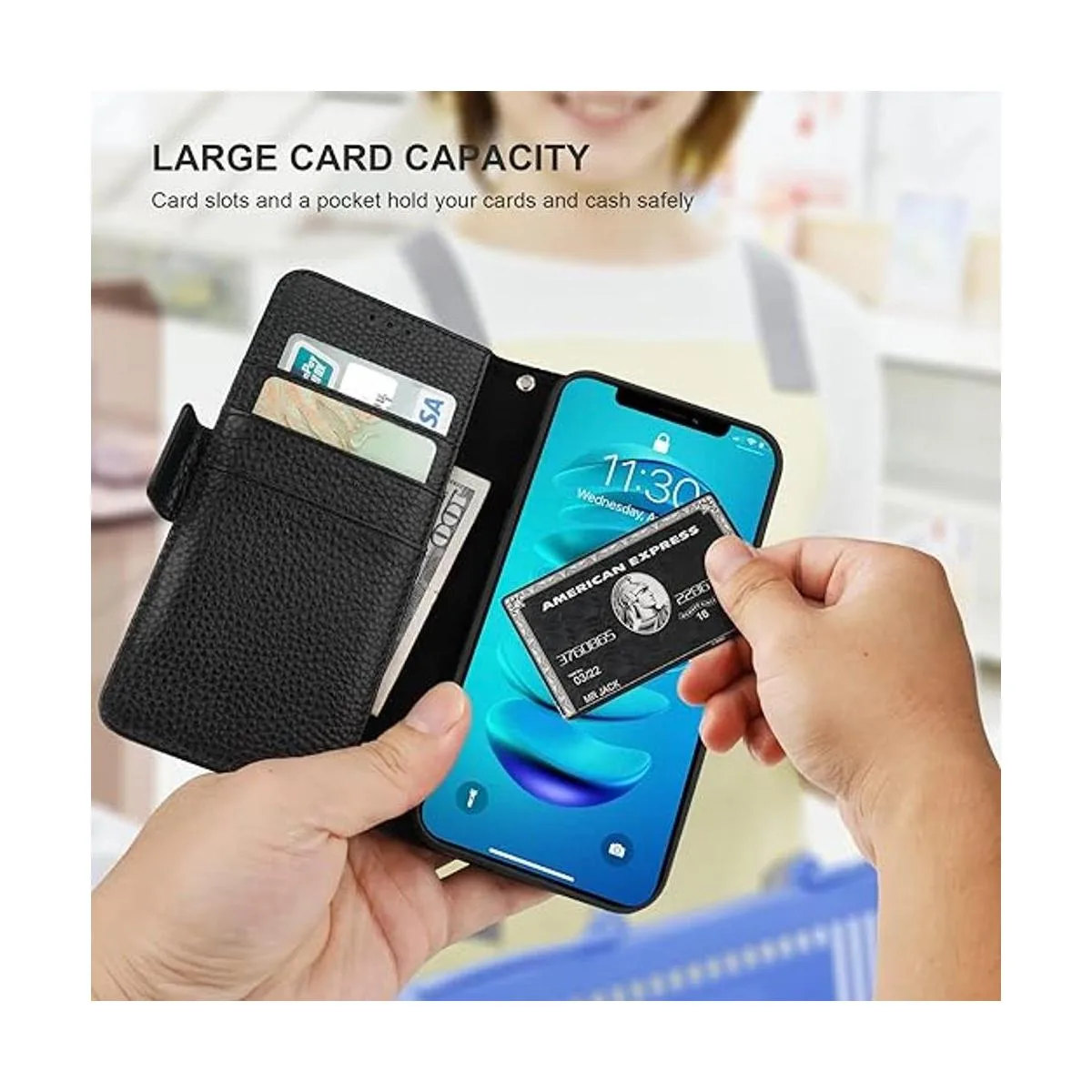 Funda de piel auténtica con cartera: esta funda con tarjetero con 3 ranuras para tarjetas y un bolsillo para dinero en efectivo puede contener tus diversas tarjetas como tarjetas de crédito, licencia de conducir, tarjeta de identificación, etc. Con la que no tienes que llevar tu cartera o bolso cuando salgas. El aspecto clásico se adapta a personas de todas las edades.