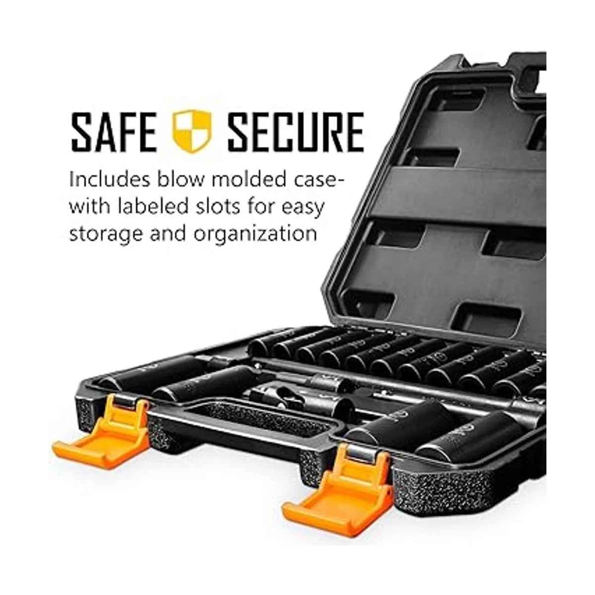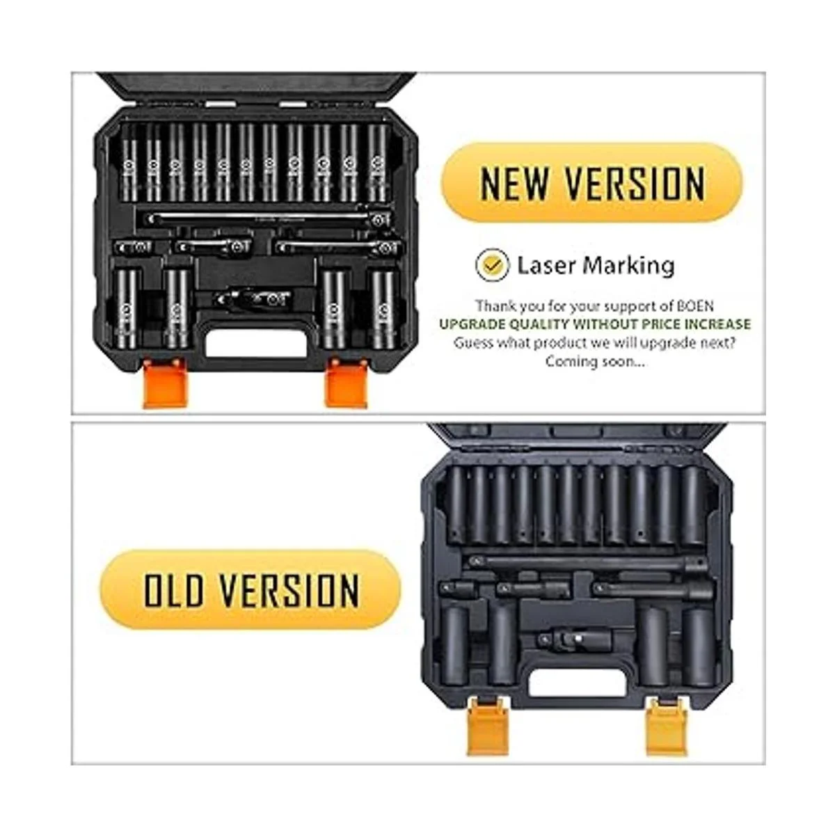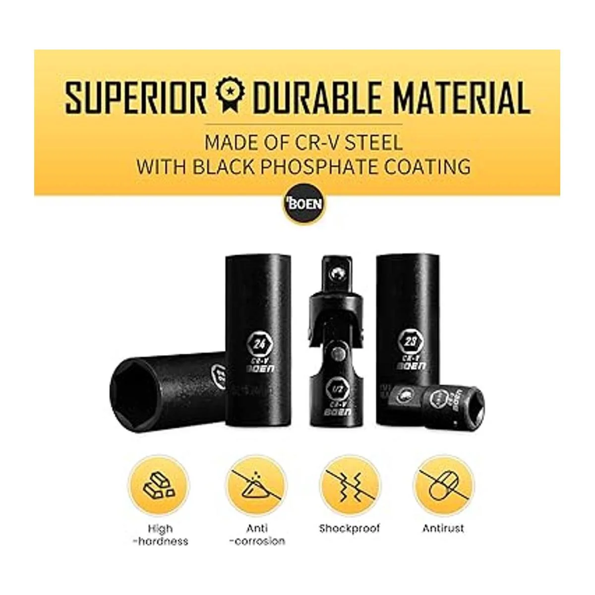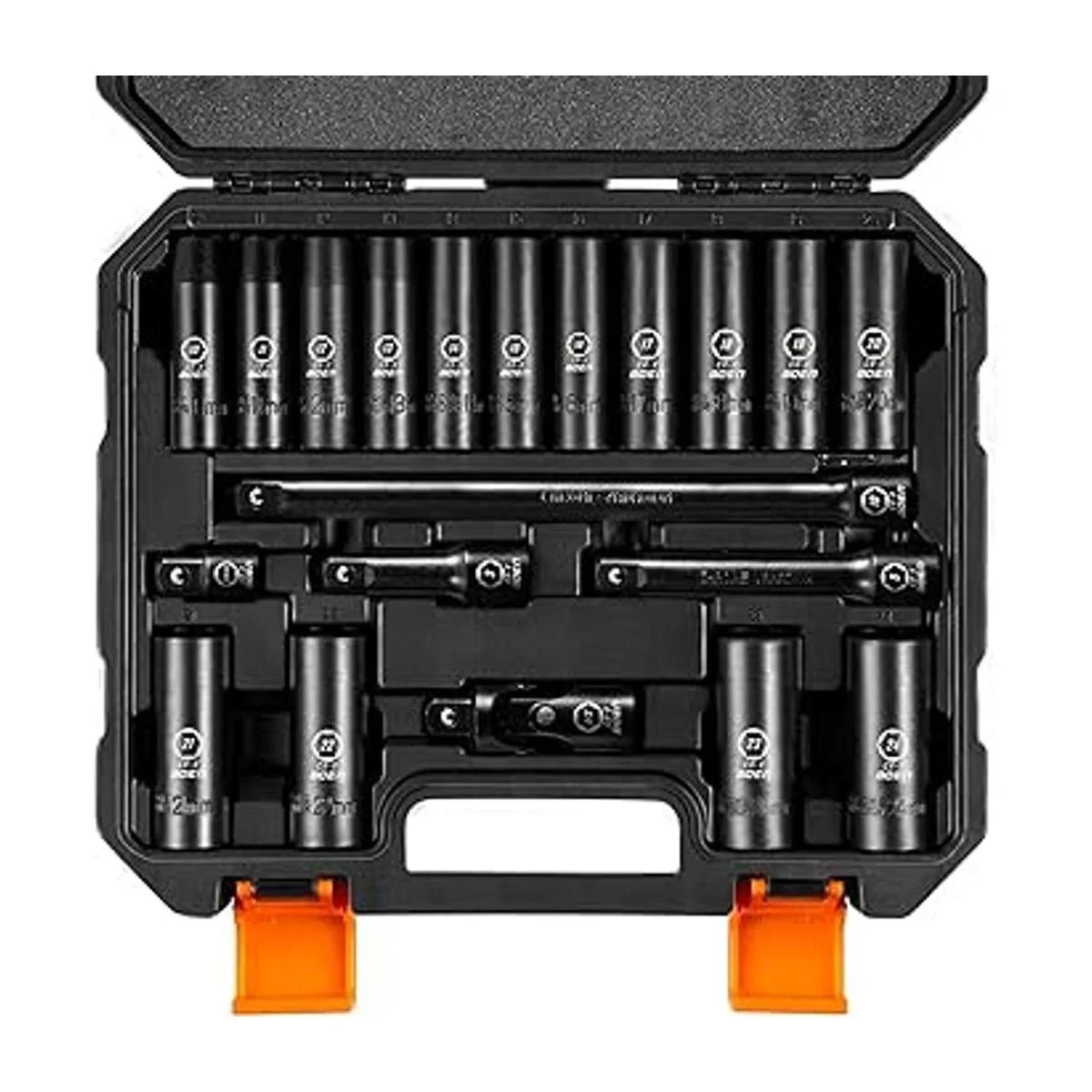 BOEN Juego de llaves métricas de impacto profundo de 12 pulgada, juego de 20 llaves métricas de acero CrV de 10 a 0.945 in, incluye barras de extensión, junta universal y adaptador, diseño de 6 puntos, cumple con las normas ANSI