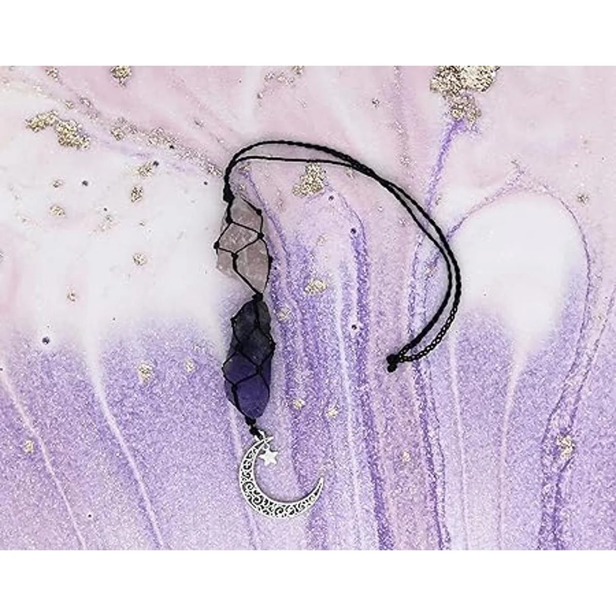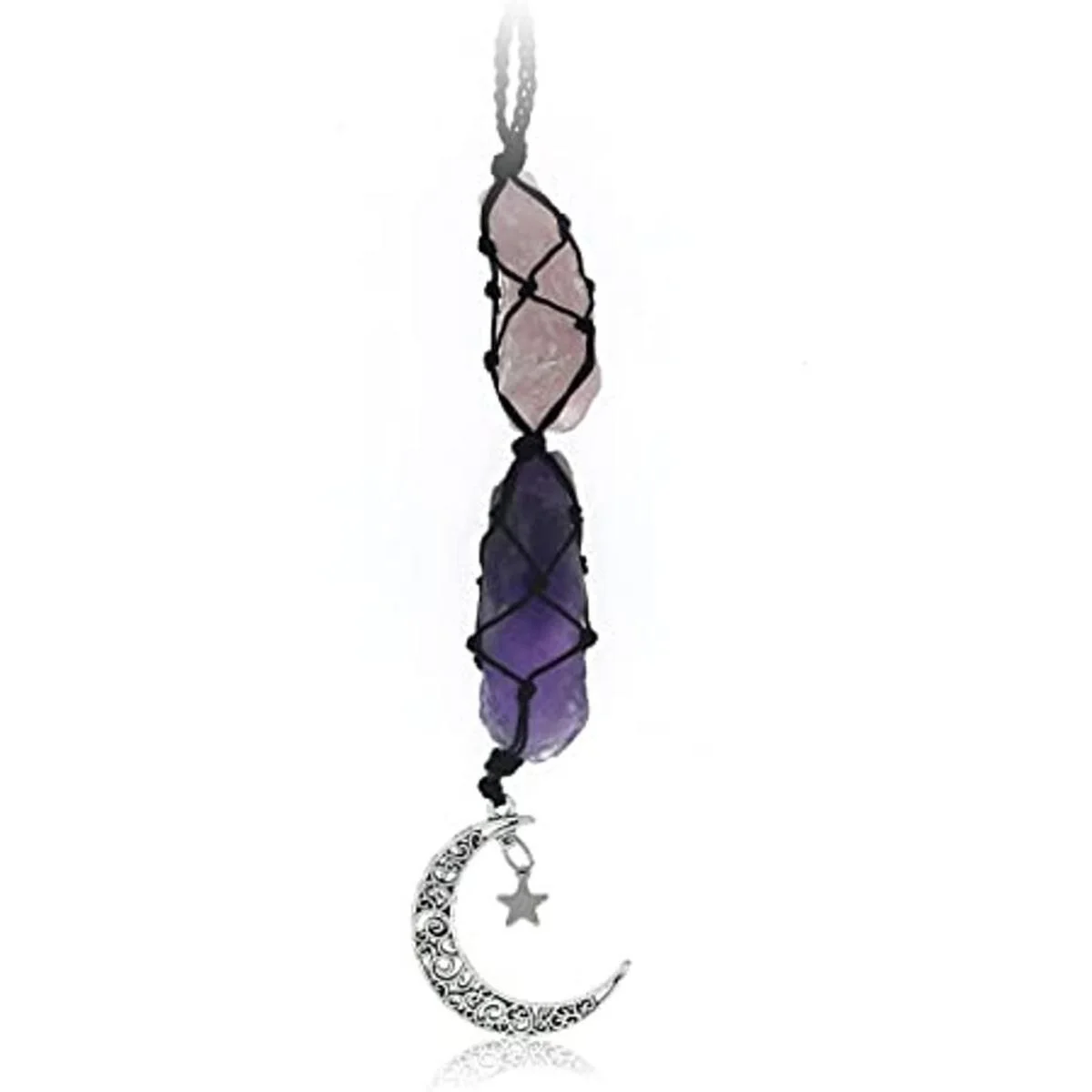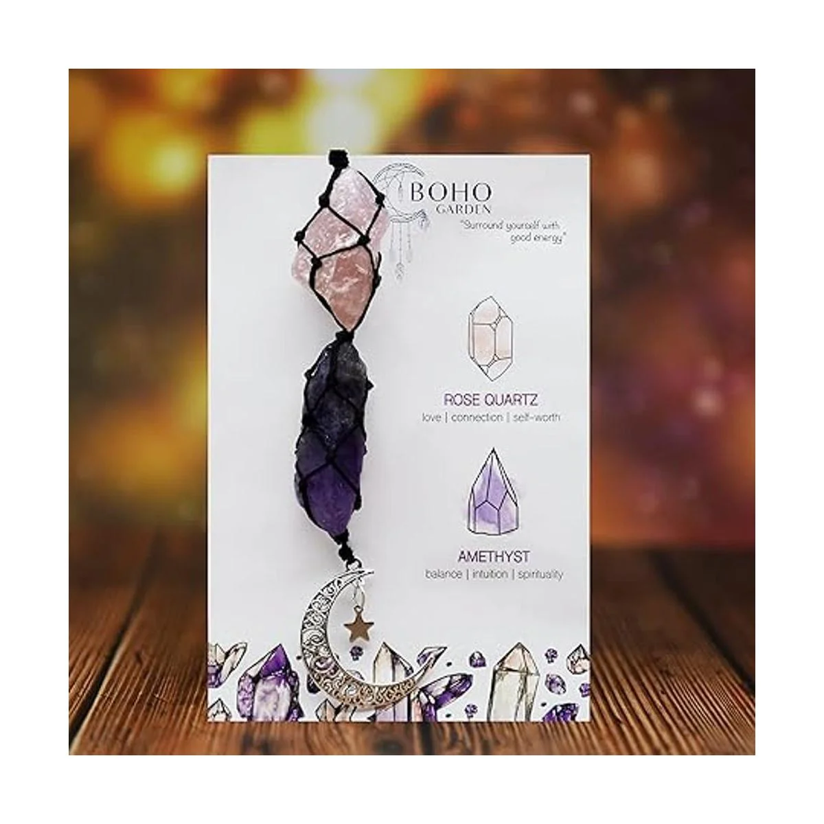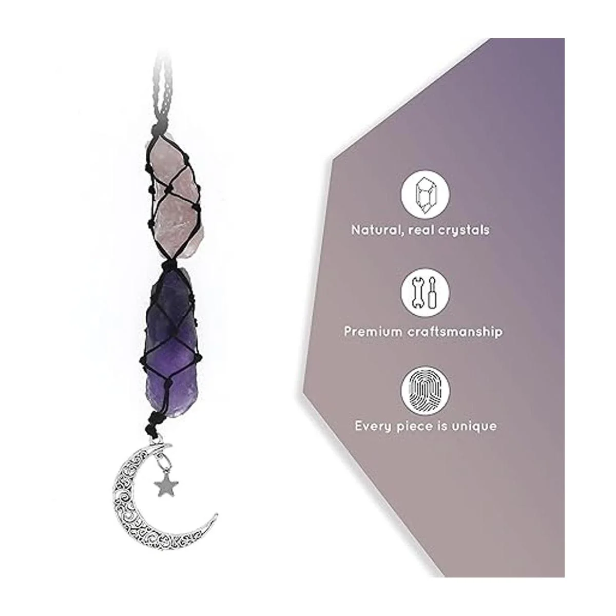 Boho Garden Dije colgante para automóvil, Cuarzo rosa, amatista, Luna colgante, accesorios de cristal curativo, Decoraciones de espejo retrovisor, Amor, conexión, autoestima, equilibrio, intuición, espiritualidad, energía