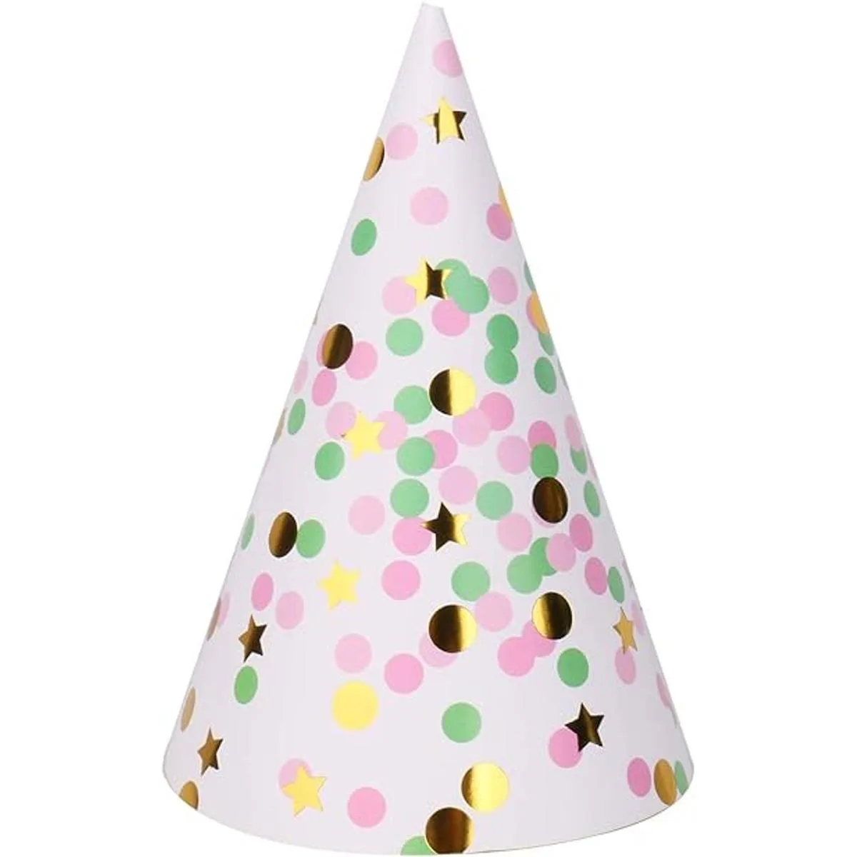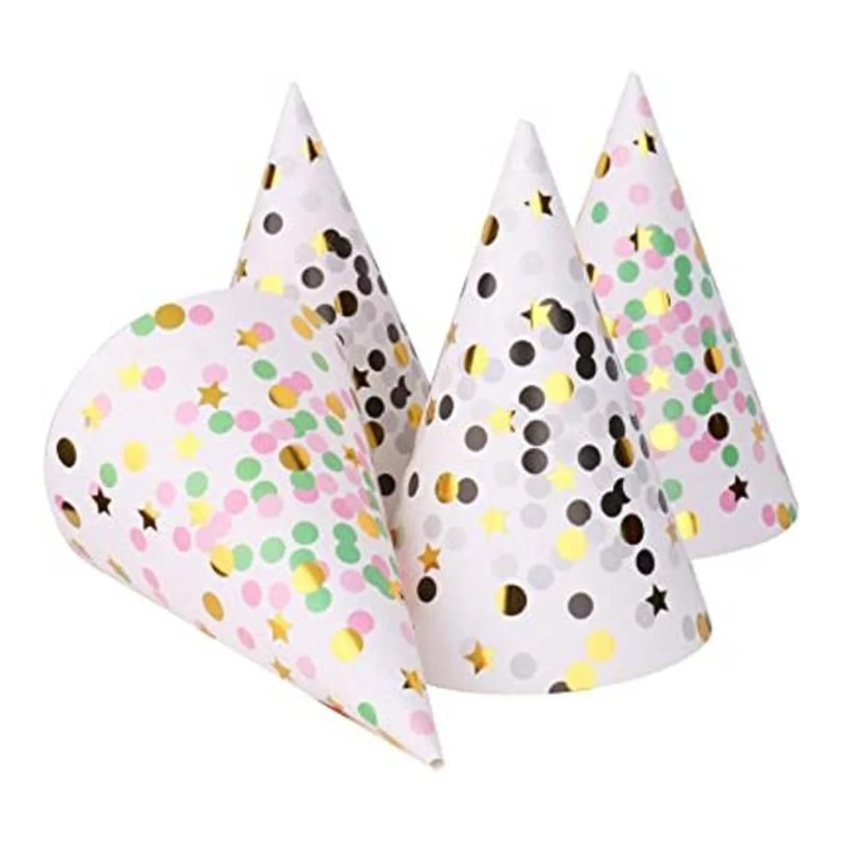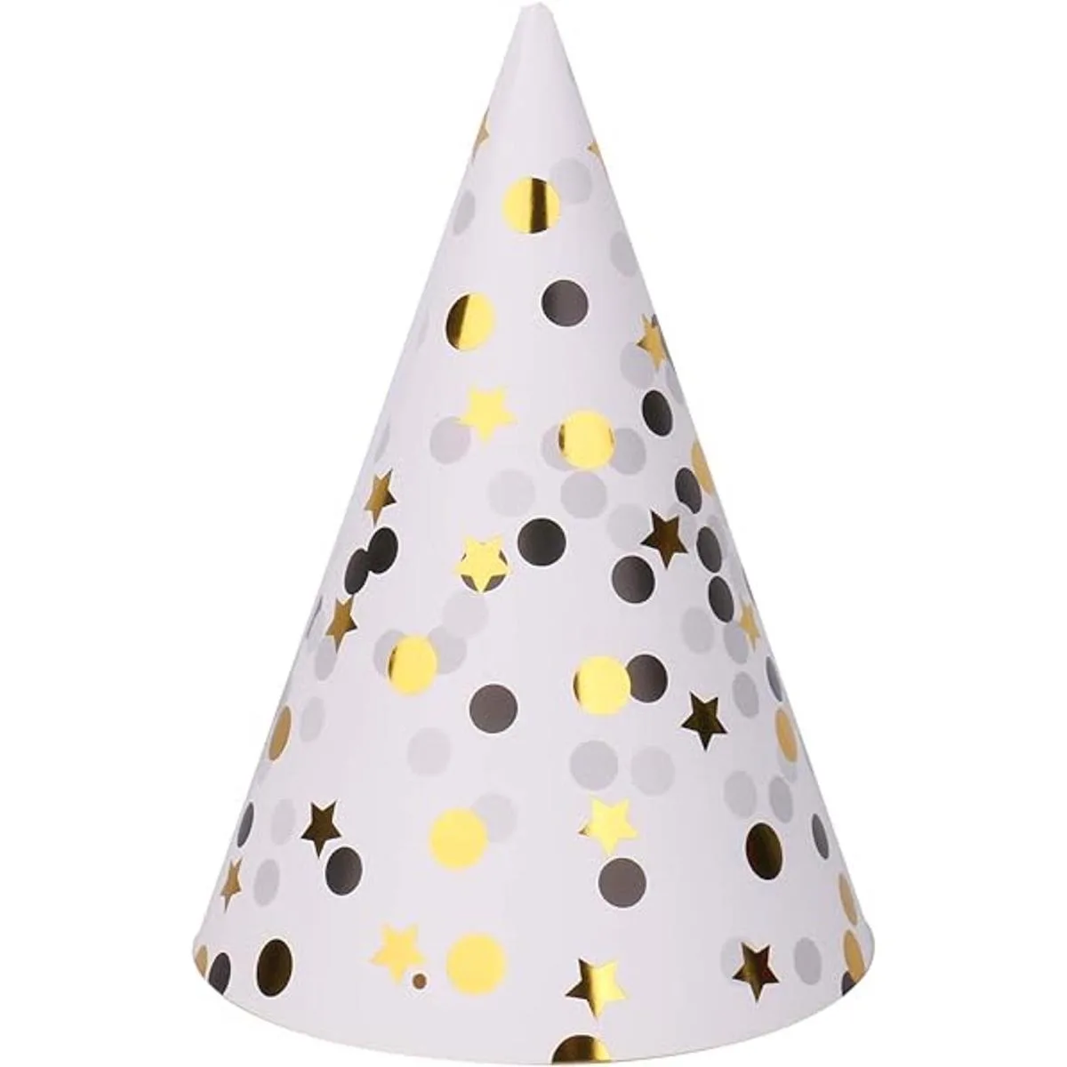 El juego de sombreros dorados para fiesta incluye 12 sombreros con 2 diseños que requieren un fácil montaje. Sombreros de papel con cono de puntos rosados, dorados y negros para tipos de fiestas.