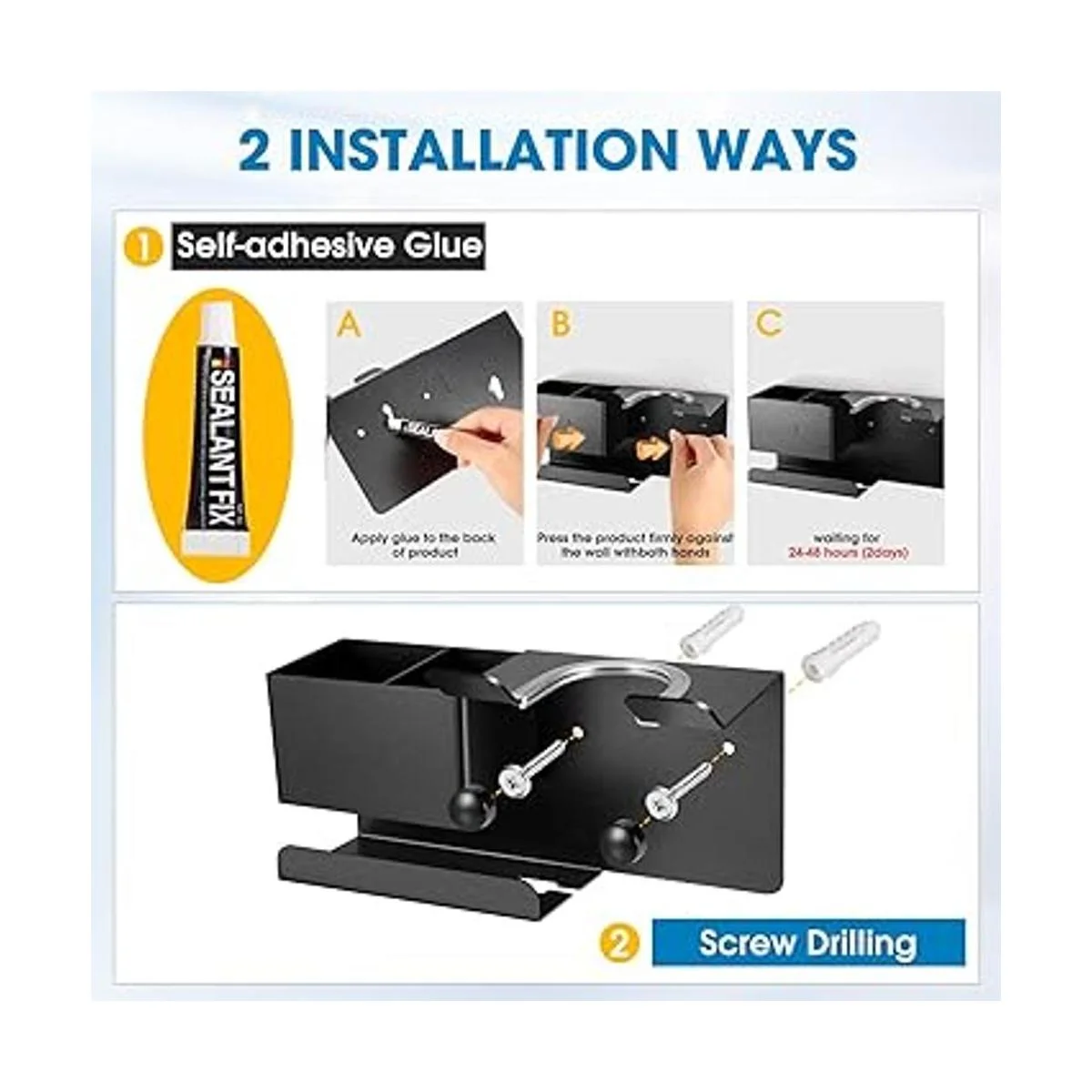Accesorios de montaje incluidos para una fácil instalación: Este estante para secador de pelo se puede instalar fácilmente en la pared de tu baño con 2 maneras de elegir: adhesivo o tornillos. Se puede fijar en la pared firmemente, no te preocupes por que se caiga.