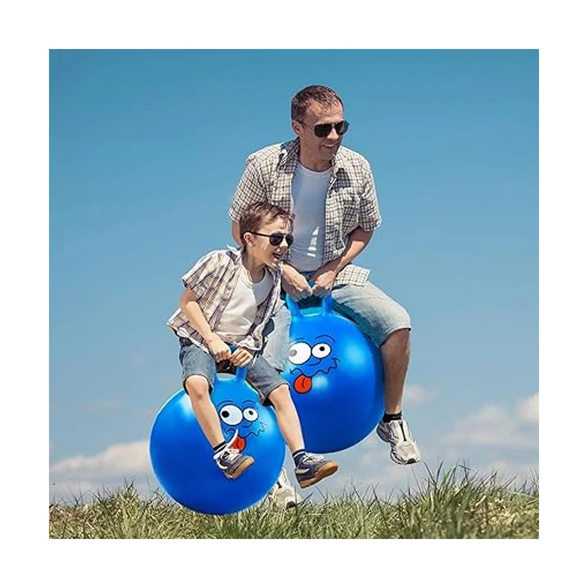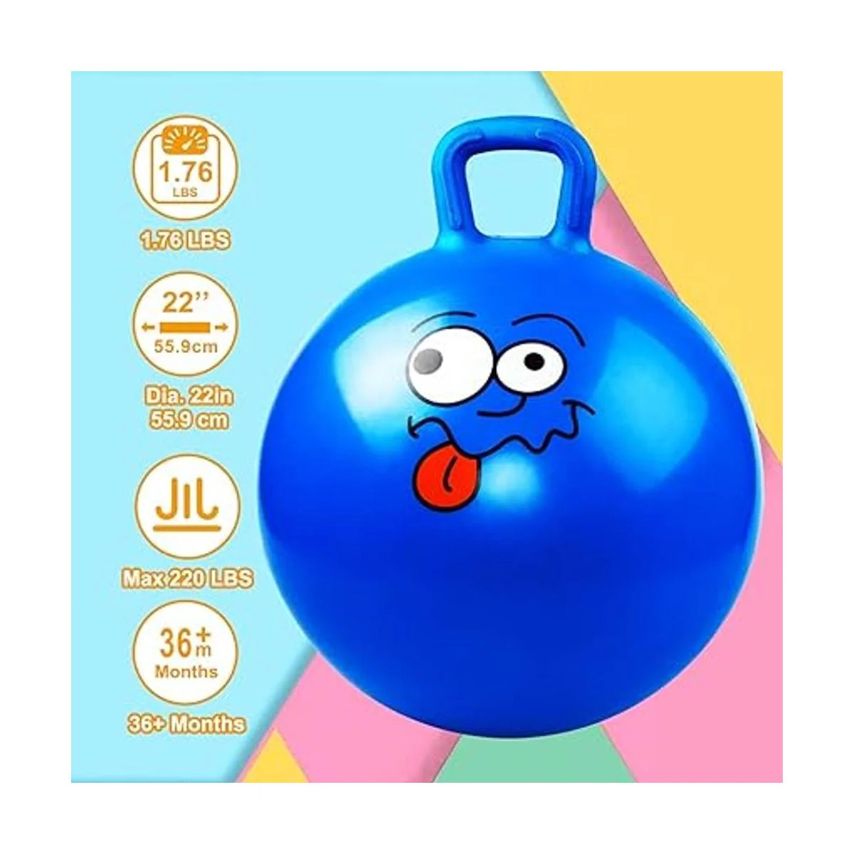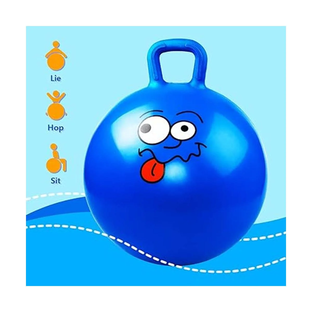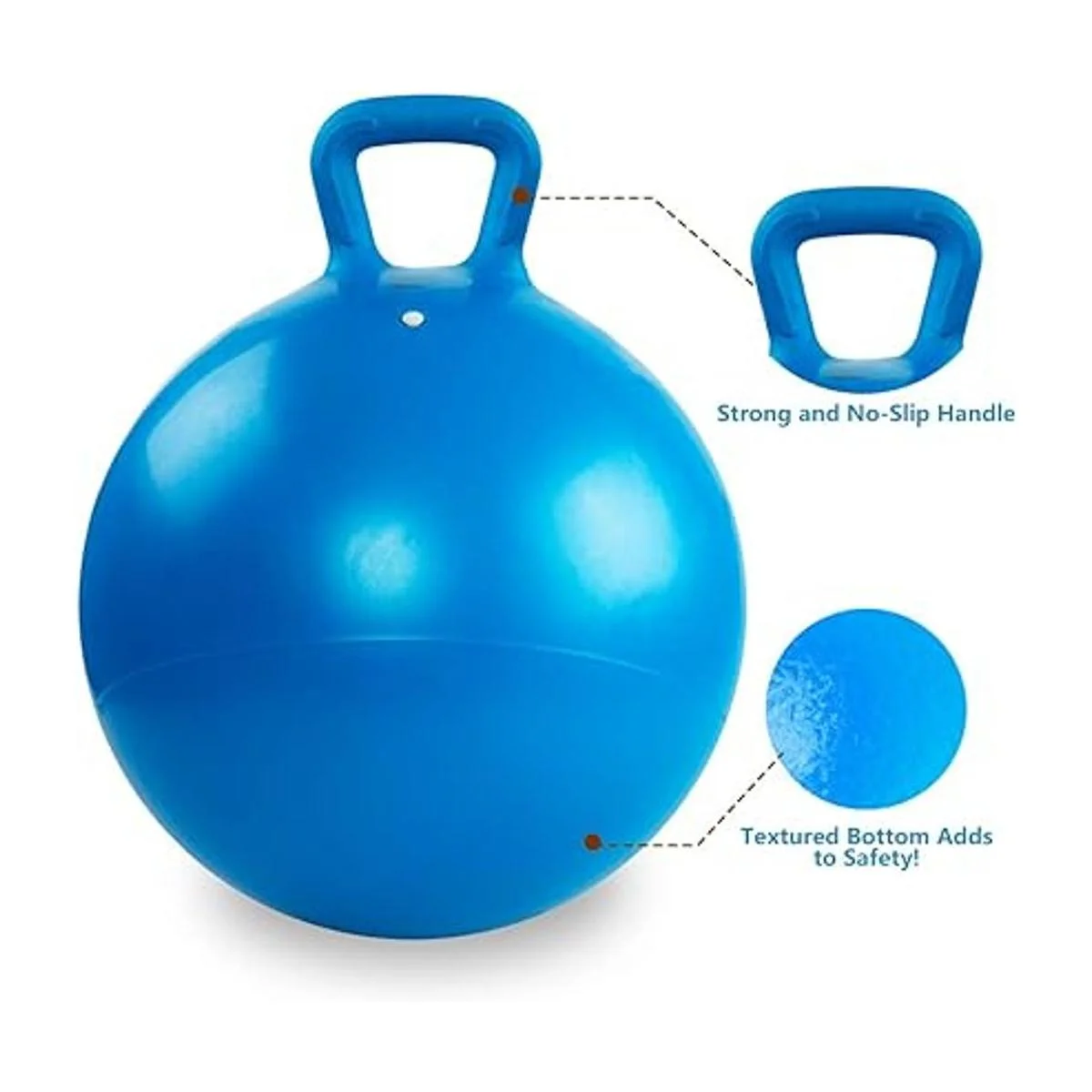 Parte inferior y asa antideslizantes: patrón antideslizante en la parte inferior de la pelota de saltar para un salto seguro. El mango de un solo bucle en la bola es perfecto para que un niño se agarre de forma segura sin deslizarse.