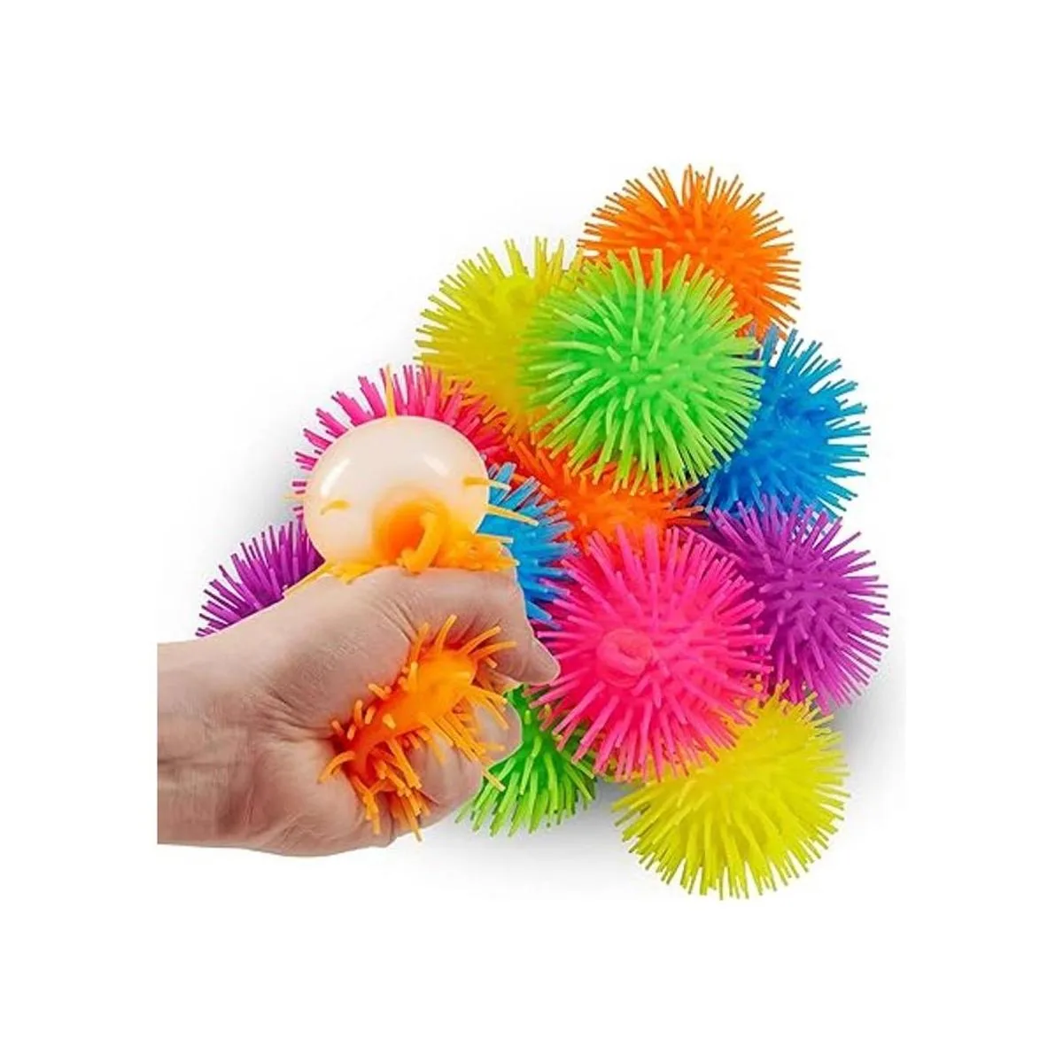 Paquete de 12 bolas infladoras Cada paquete a granel de bolas infladas para niños incluye un total de 12 juguetes grandes para aliviar el estrés hechos de goma gruesa y en varios colores neón, incluyendo: naranja, azul, verde, morado, amarillo y rosa. Puedes sostener, lanzar, apretar y tirar para un sinfín de horas de diversión y disfrute