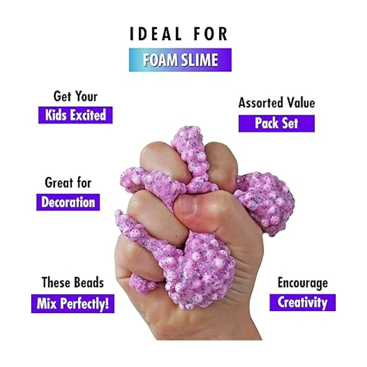 Fomenta la creatividad: da rienda suelta a la creatividad de tu hijo y estimula su imaginación permitiéndoles tener horas de entretenimiento utilizando estas bolas ligeras que también estimularán su sentido táctil; añade mini rebanadas de frutas para slime, mini cuentas flotantes, cuentas de espuma grandes, abejas de espuma arcoíris, cuentas de espuma grandes de colores o tu slime favorito para jugar y hacer el mejor slime decorativo satisfactorio de cuentas de espuma