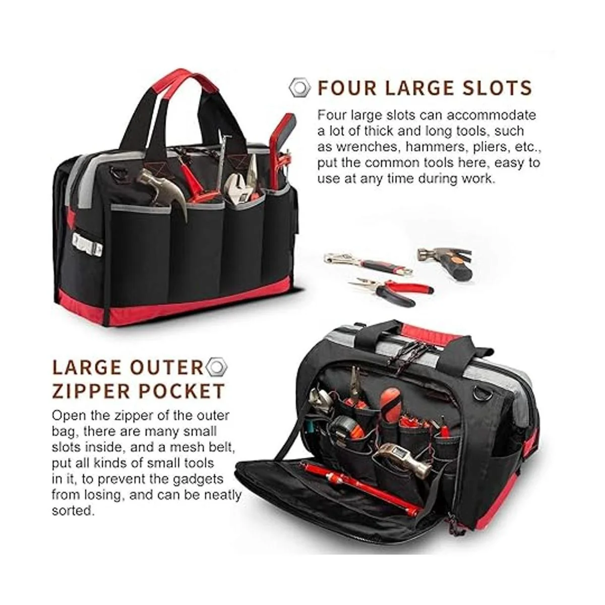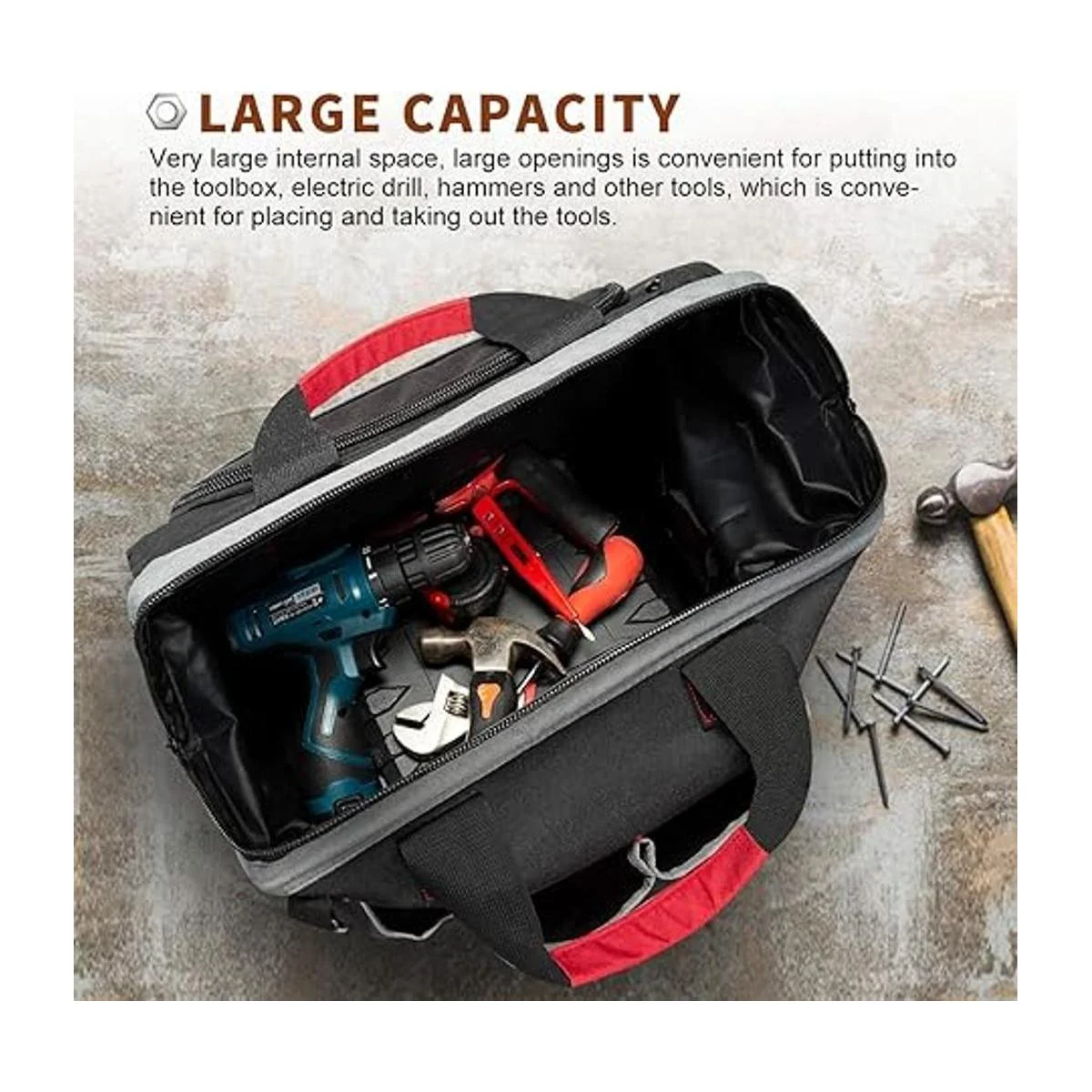 WIDE OPEN TOP MOUTH This large tool bag features wide open mouth with an internal metal frame and top doublepull zipper for easy organization and access.Just pull the zipper to open this bag smoothly and put in or take out your tools quickly when you needed.
